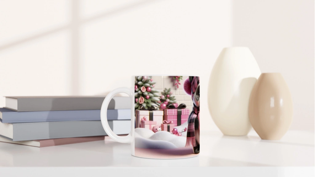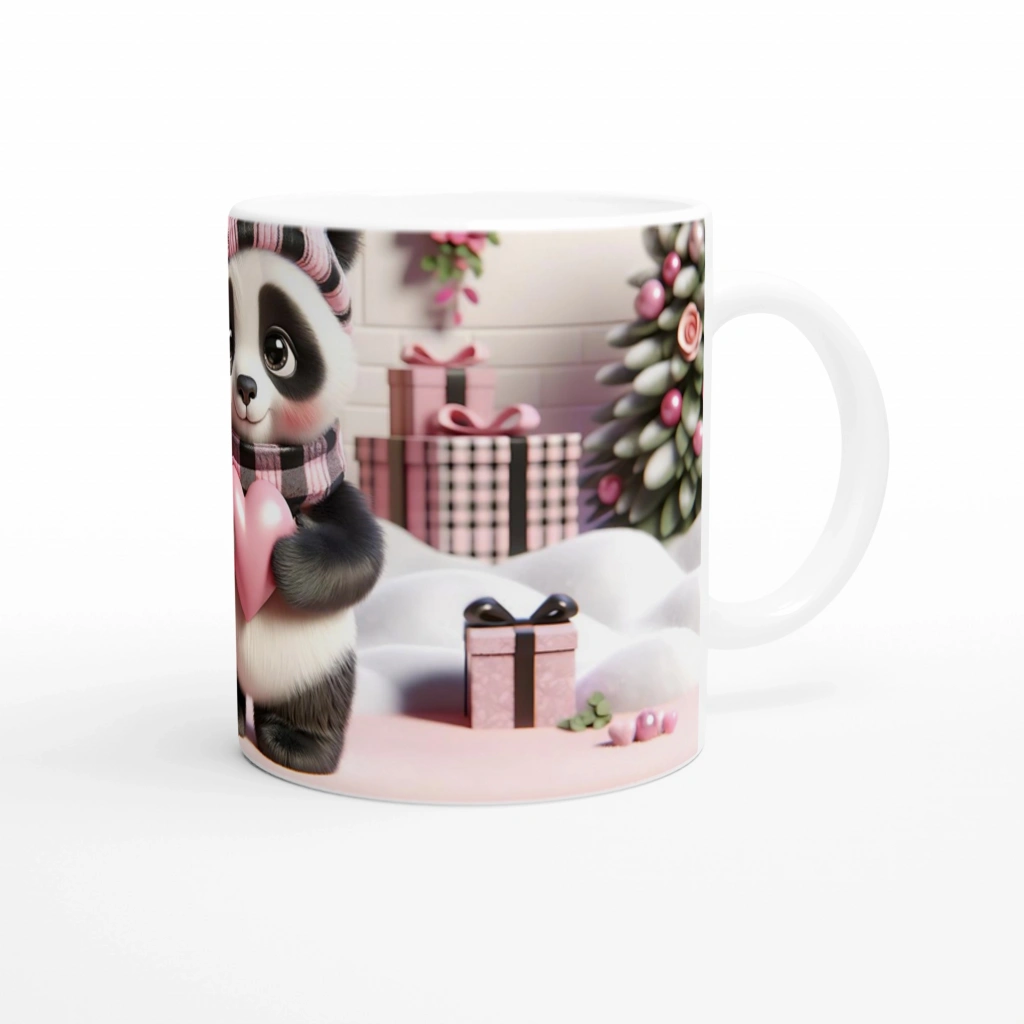 Kalpli Hediye Tutan Sevimli Panda Temalı Baskılı Kupa Bardak, pembe-siyah desenli atkısı ve hediye kutularıyla süslenmiş arka planıyla romantik ve neşeli bir hava yaratır. Hem kış günleri hem de özel anlar için mükemmel bir armağan seçeneği.