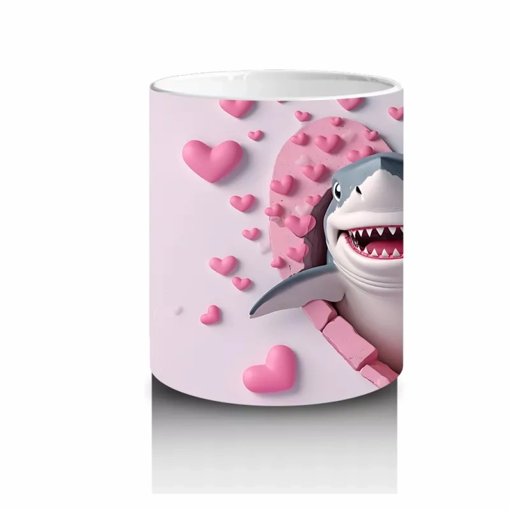 Kalpli pembe zeminde gülen sevimli köpekbalığı figürü, tatlı ve içten bir görünüm sunuyor. Romantik ve samimi detayları sevenlere hitap eden bir tasarım.