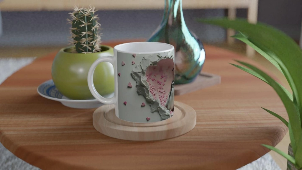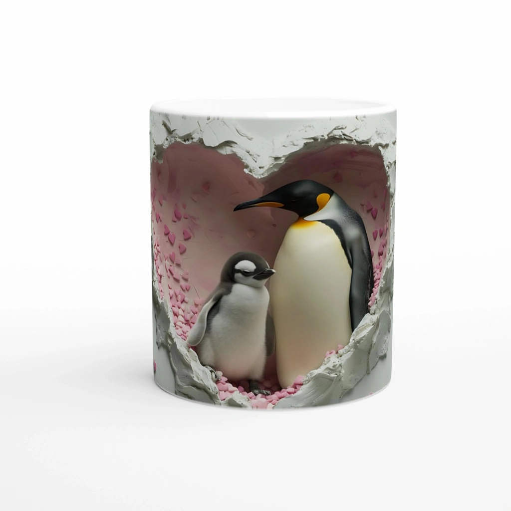 Kalp şeklindeki kırık duvardan bakan yavru ve yetişkin penguen figürleriyle tasarlanmış bu kupa bardak, aile sevgisinin ve doğanın zarafetinin birleşimini simgeliyor. Pembe kalp detaylarıyla süslenen arka plan, bu özel tasarımı daha da duygusal ve özgün kılıyor.