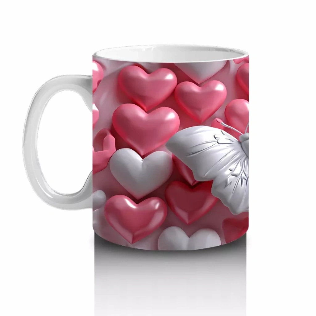 Kalp desenli yastıkların üzerinde nazikçe duran beyaz kelebek, sevgi ve huzur dolu bir atmosfer yaratıyor. Romantik ve sakin tasarımları sevenler için özel bir kupa.