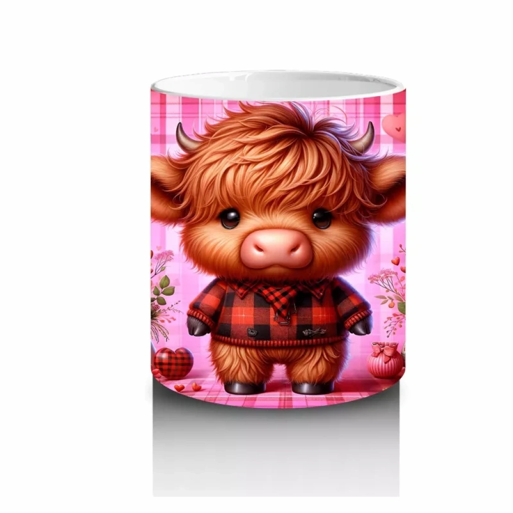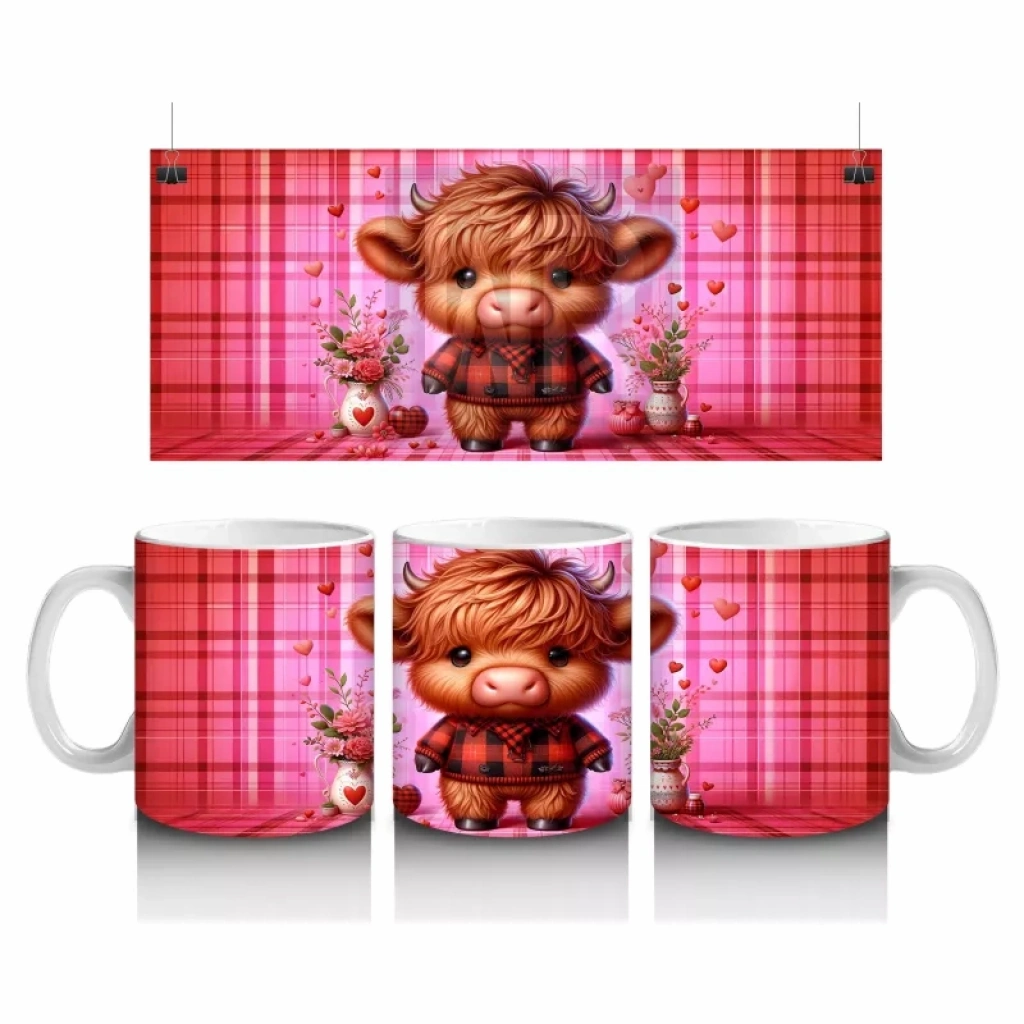 Pastel tonlardaki kareli arka plan önünde çiçek tutan bu sevimli buzağı, içten ve neşeli bir atmosfer sunuyor. Özellikle çocuklar ve hayvan temalı hediye arayanlar için ideal.