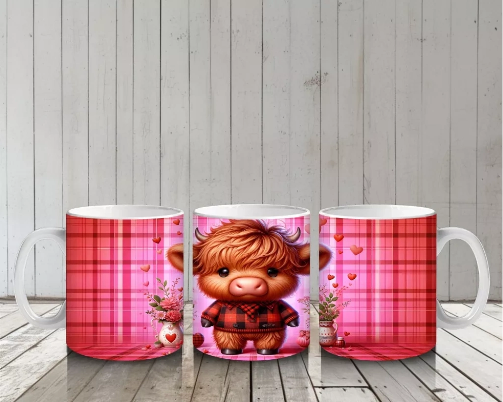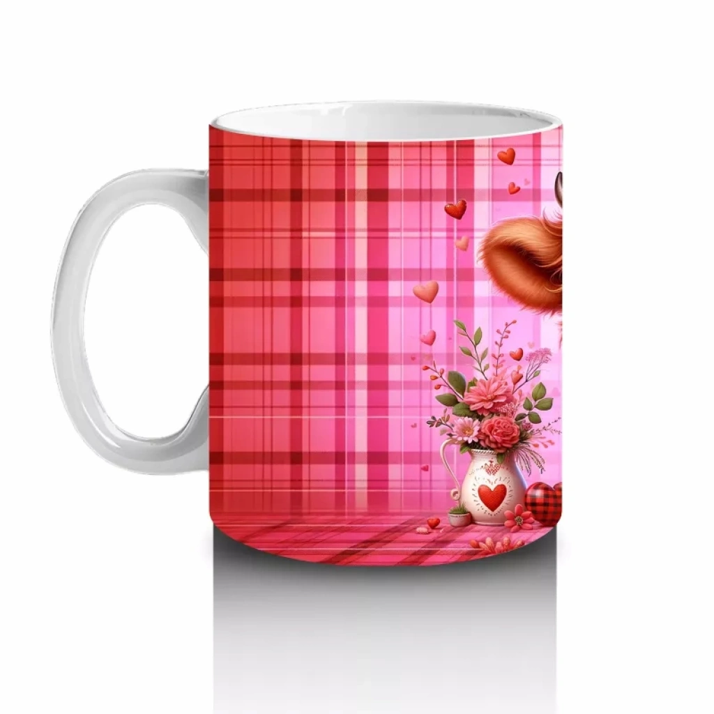 Kareli Arka Planda Çiçek Tutan Sevimli Buzağı – Baskılı Kahve Kupası
