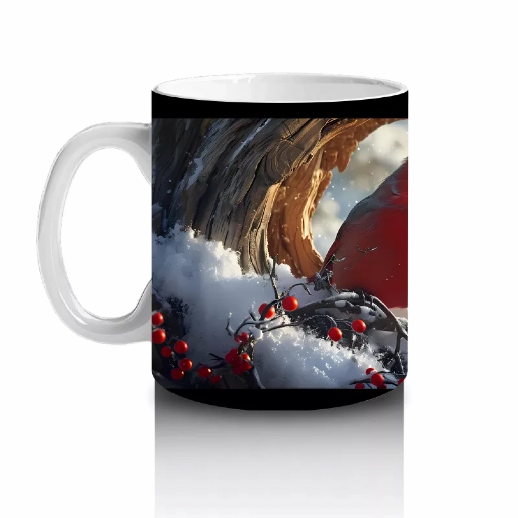 Kış manzarasının zarifliğini taşıyan bu kardinal kuşu, karla kaplı dallar arasında canlı renkleriyle öne çıkıyor. Soğuk mevsimlerin huzurunu yansıtan dingin ve estetik bir kupa tasarımı.