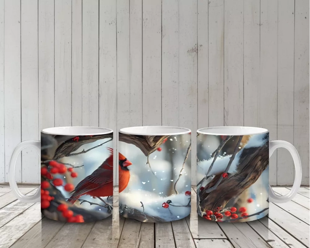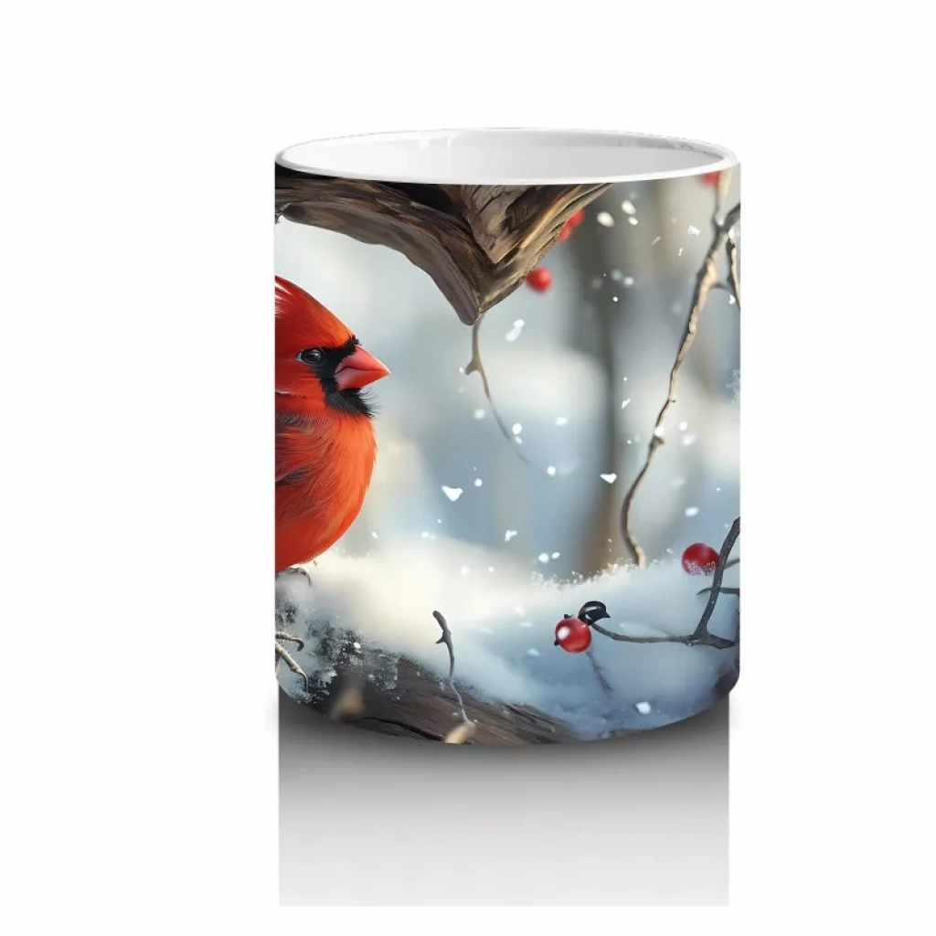 Karlı dallar üzerinde duran kardinal kuş çifti, sevgi ve doğallığı simgeliyor. Romantik ve doğa temalı detayları sevenler için sıcak ve özel bir kupa.