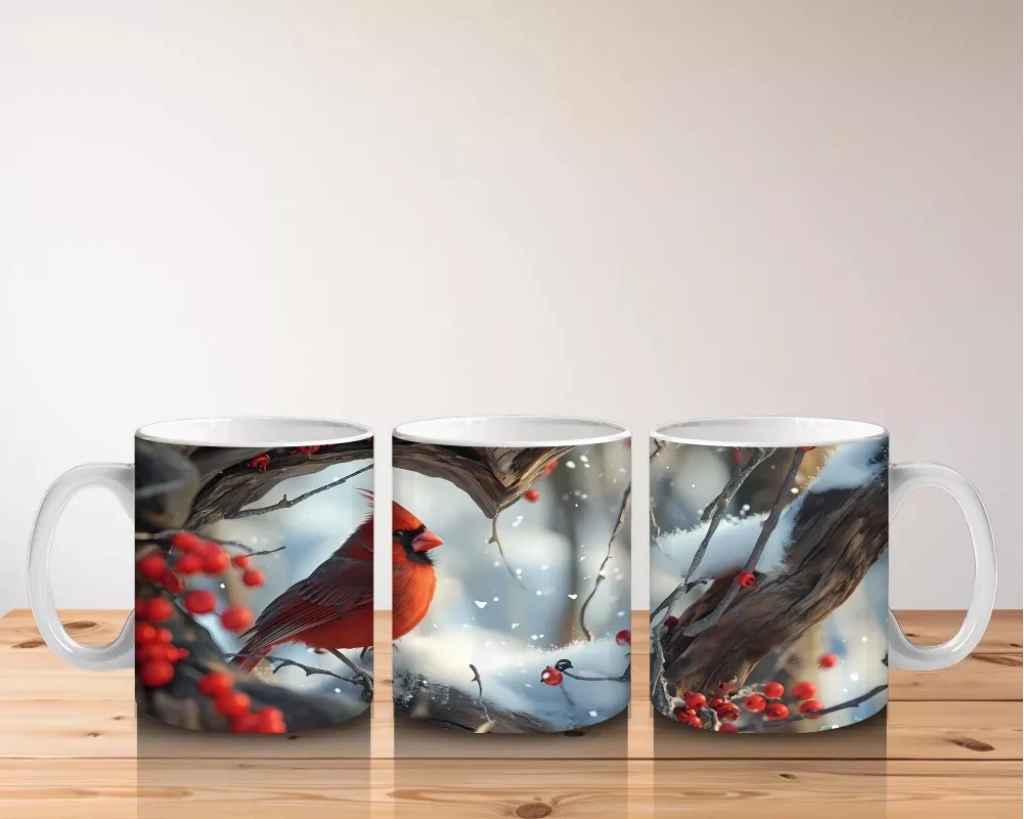 Karlı Dallarda Kardinal Kuş Çifti – Baskılı Kahve Kupası