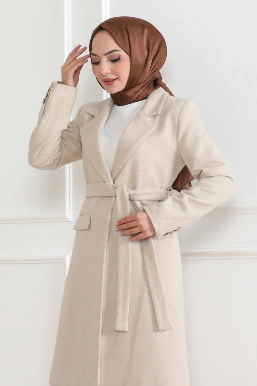 Kaşe Kaban – Uzun Boy Kruvaze Yaka, Kuşaklı Tesettür Kışlık Kaban, Astarlı Şık Yünlü Dokuma Oversize Rahat Kalıp, Cepli Modern Kaşe Mont Modeli - Bej
