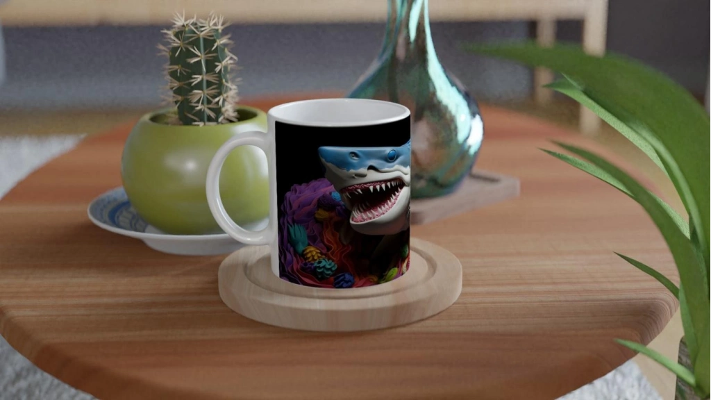 Modern heykelsi çizgileri, deniz kabukları ve renkli balıklarla birleşen bu tasarım, özgün detaylarıyla dekoratif bir kupa arayanlar için eşsiz bir seçim.