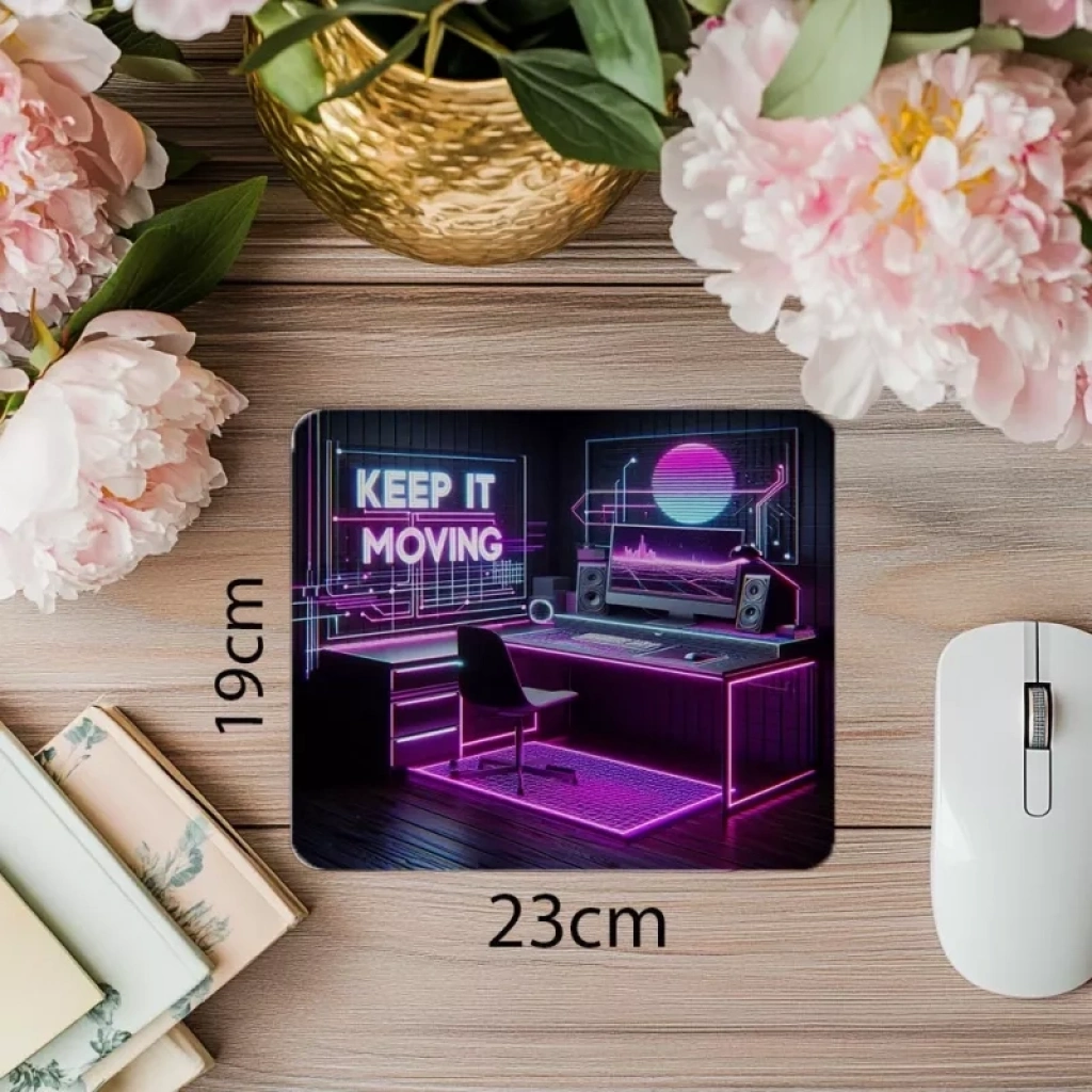 “Keep It Moving” yazılı parlak mousepad, canlı parlak yüzey ve pürüzsüz kaydırma deneyimiyle hareketliliği destekler; kaymaz tabanıyla güvenli kullanım sunar.