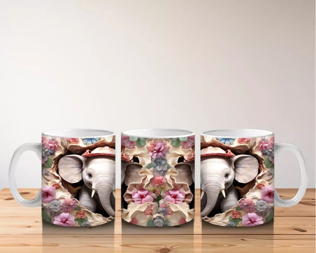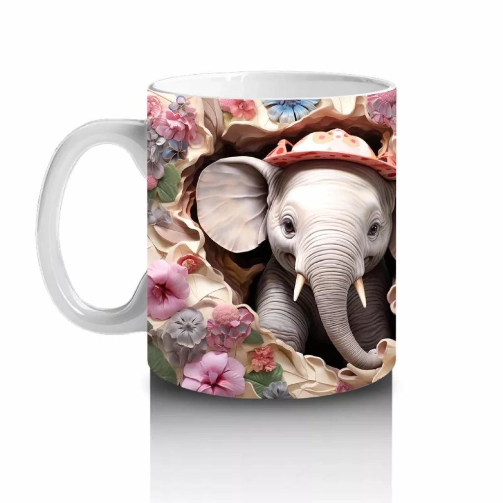 Kırmızı Şapkalı Filler Arasında Çiçekler – Baskılı Kahve Kupası