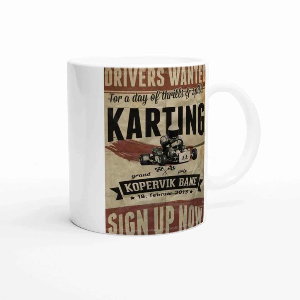 Retro karting afişinden ilham alan bu bardak, hız ve heyecan sevenler için enerjik bir hediye alternatifi sunar.