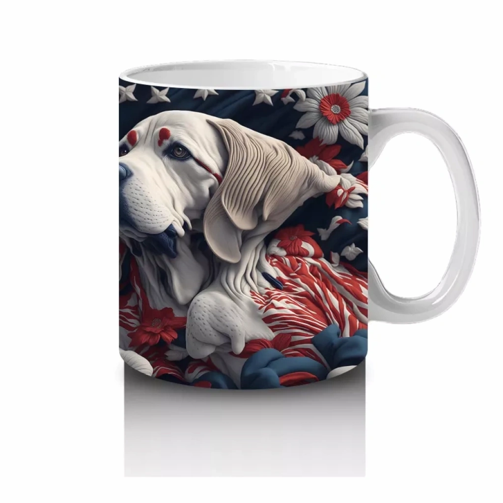 Koyu tonlarda çiçek desenleri önünde duran zarif köpek figürleri, sofistike ve sakin bir atmosfer yaratıyor. Estetik ve dengeli tasarımları sevenler için şık bir kupa.