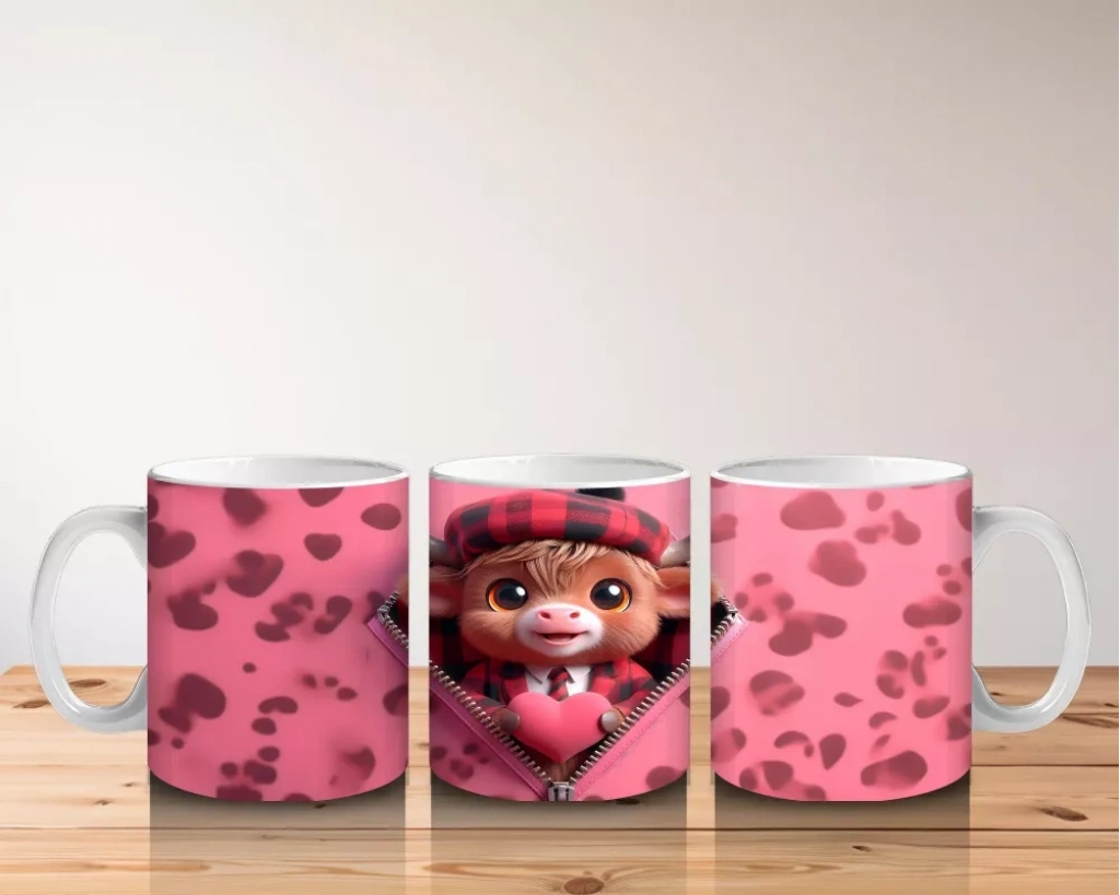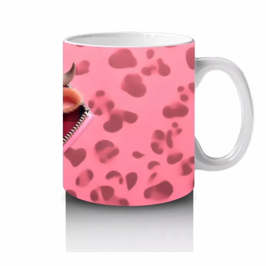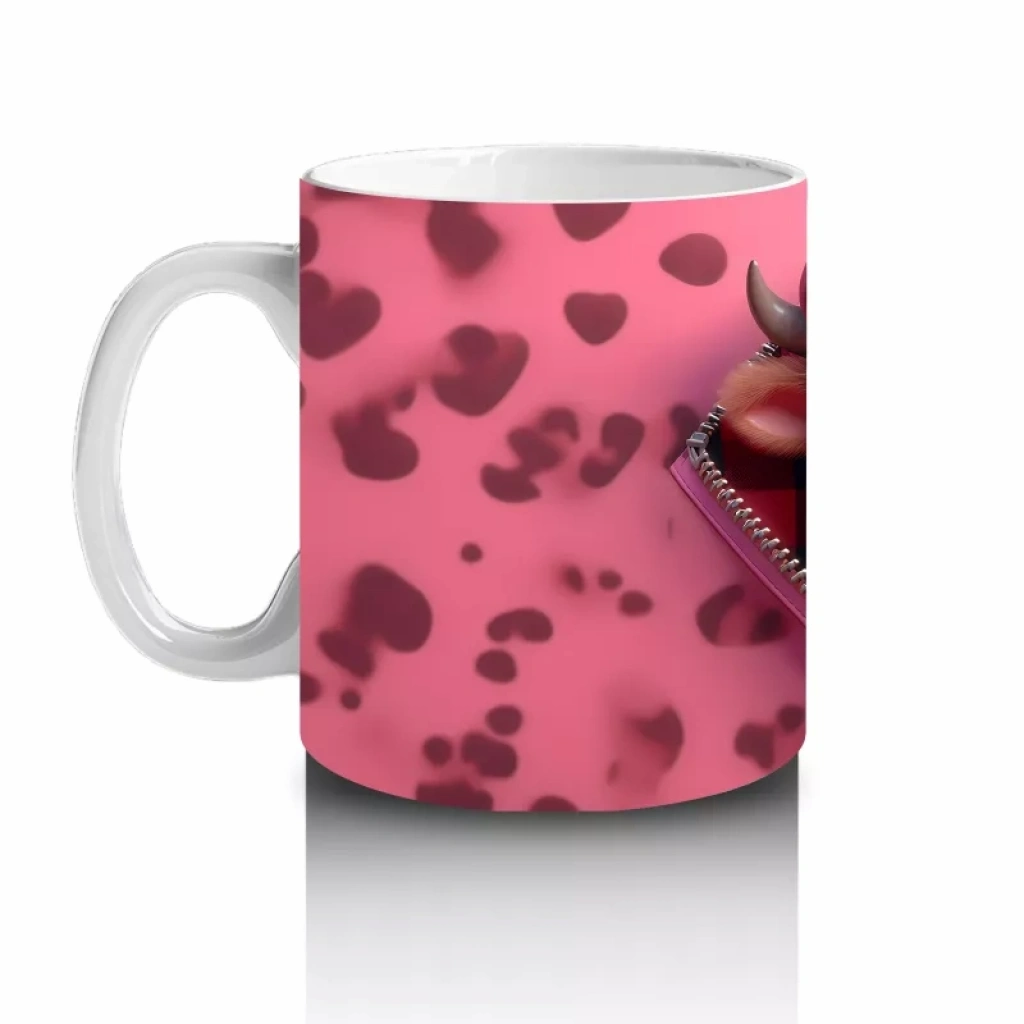 Koyu Pembe Desenli Zeminde Kalpli Boğa Figürü – Baskılı Kahve Kupası