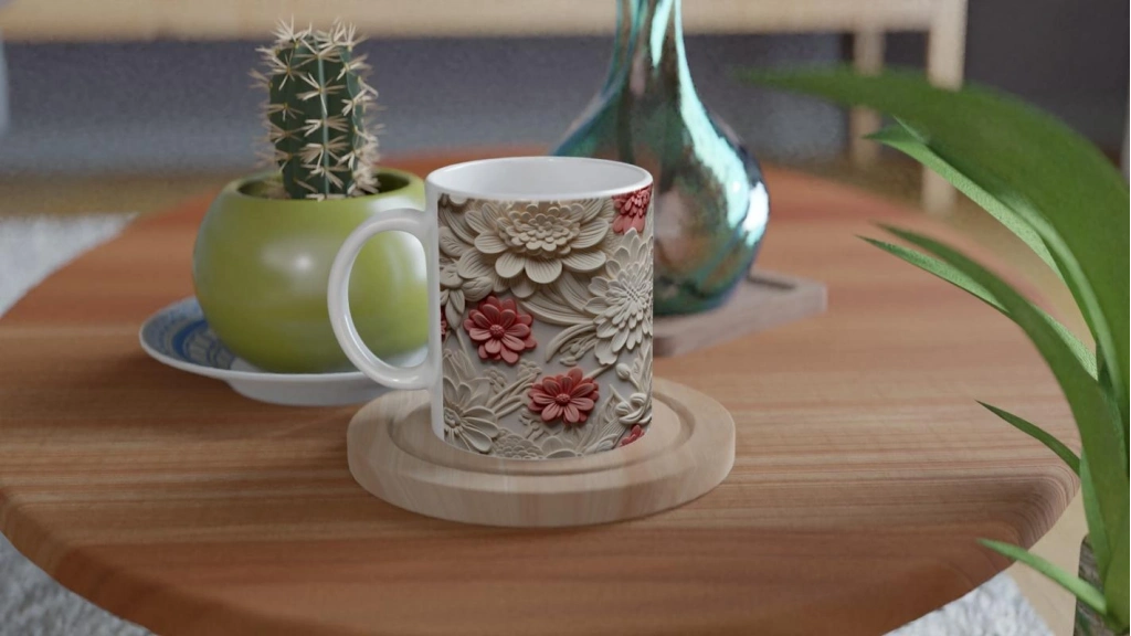 Farklı boyutlardaki kabartmalı çiçek detayları sayesinde derinlik hissi veren bu özel tasarım kupa bardak, hem şık sunumlar hem de estetik hediye seçenekleri için ideal bir parça.