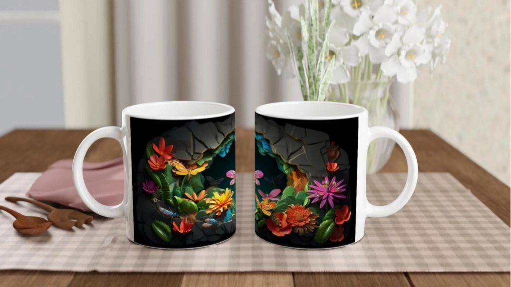 Mağaradaki Renkli Yusufçuklar ve Çiçekler Temalı Baskılı Kupa Bardak, taş dokulu fon, tropik bitkiler ve göz alıcı yusufçuklar ile doğanın fantastik güzelliğini yansıtır. Doğaseverler, renkli tasarımlardan hoşlananlar ve dikkat çekici hediyeler arayanlar için mükemmel bir seçimdir.