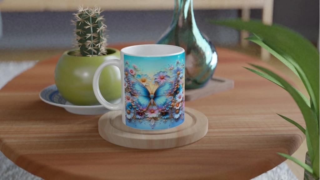 Mavi Işıltılı Kelebek ve Çiçekler Temalı Baskılı Kupa Bardak, pastel geçişli arka plan üzerinde parıltılarla süslenmiş zarif bir kelebek ve çevresini saran detaylı çiçek kompozisyonuyla romantizmi ve zarafeti buluşturuyor. Hem görsel şölen sunan hem de doğanın güzelliğini yansıtan bu tasarım, hediye veya kişisel kullanım için mükemmel bir seçenek.