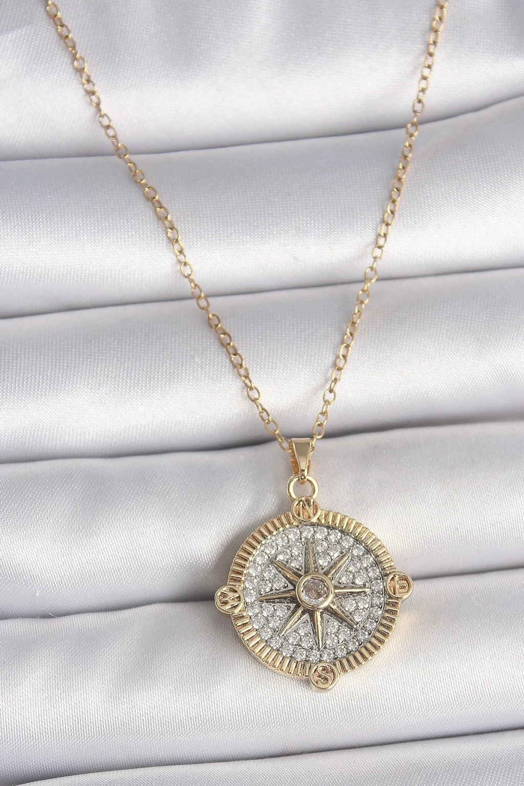 316L Çelik Gold Renk Zirkon Taşlı Pusula Model Kadın Kolye