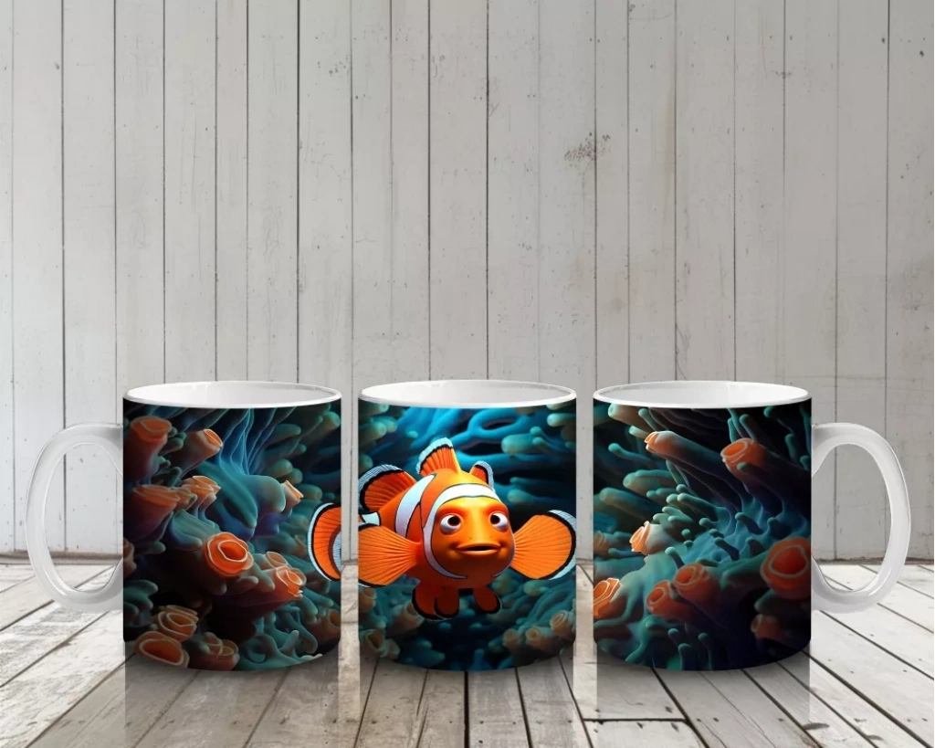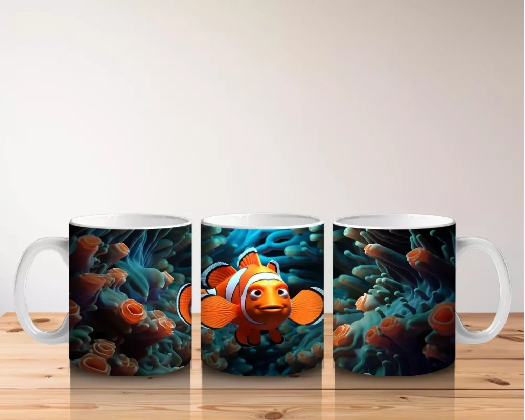 Mavi mercanların arasında süzülen palyaço balığı, deniz altı dünyasının renkli ve neşeli yüzünü yansıtıyor. Canlı ve eğlenceli detayları sevenler için özel bir kupa tasarımı.