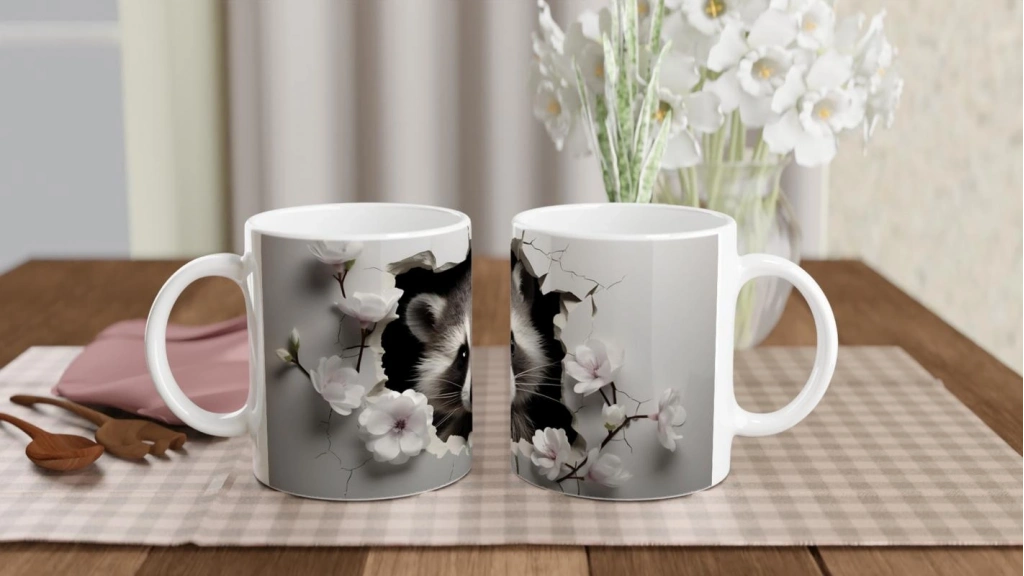 Meraklı Gözlerle Bakan Rakun Temalı Baskılı Kupa Bardak, çatlak duvar efekti içinden fırlayan minik rakun figürüyle tasarlandı. İnce beyaz çiçeklerle çevrili tasarım, sade şıklığı ve doğa dostu enerjiyi bir araya getiriyor.