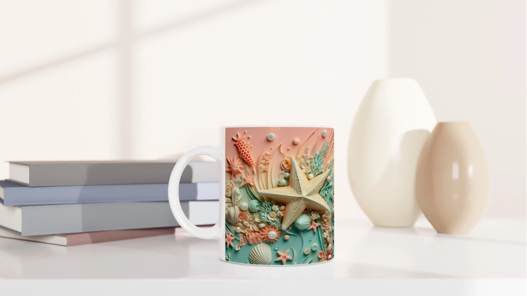 Mercanlar Arasında Deniz Yıldızı Temalı Baskılı Kupa Bardak, deniz kabukları, yosunlar ve mercan dokularıyla süslenmiş tasarımıyla yazın neşesini ve doğanın zarafetini bir arada sunar. Deniz tutkunları için göz alıcı ve huzur verici bir seçim.
