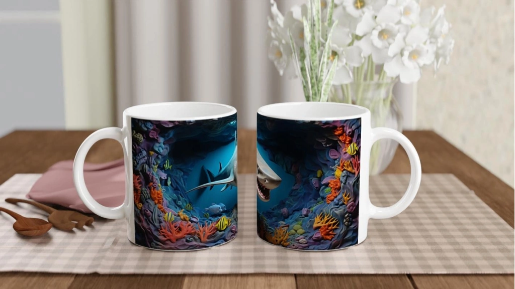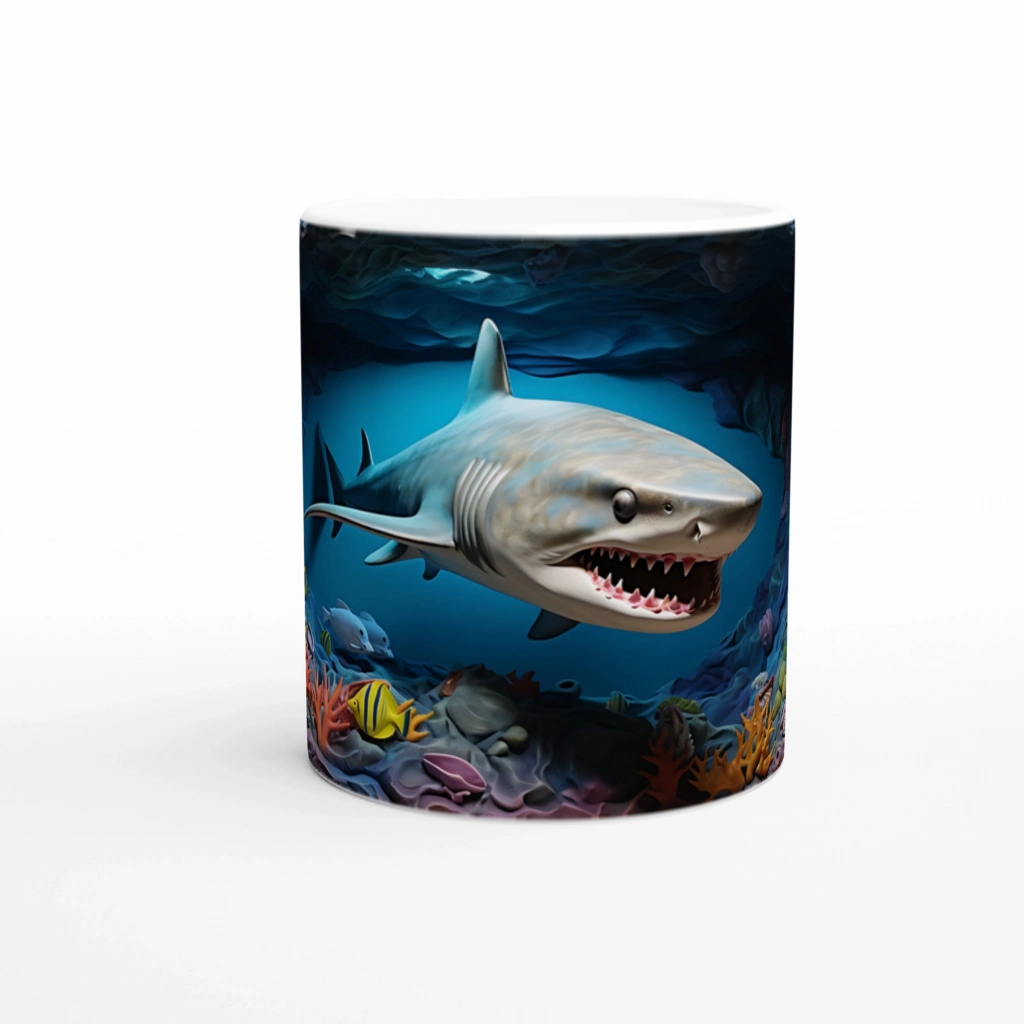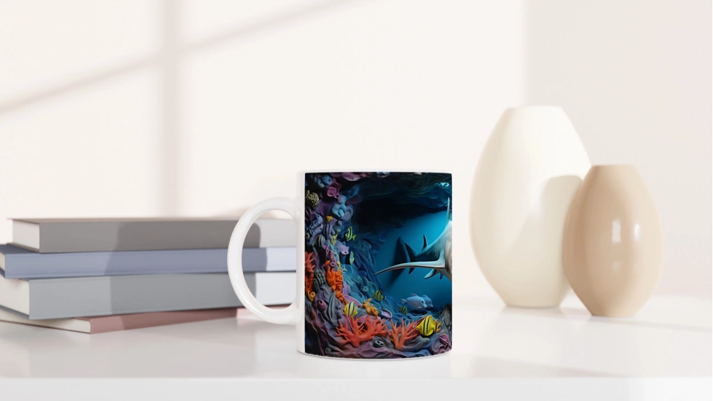 Canlı renkleri ve dinamik köpekbalığı illüstrasyonuyla Mercanlar Arasında Yüzen Tehlike Kupa Bardak, çocuklar ve deniz severler için eğlenceli ve dikkat çekici bir hediye seçeneğidir.