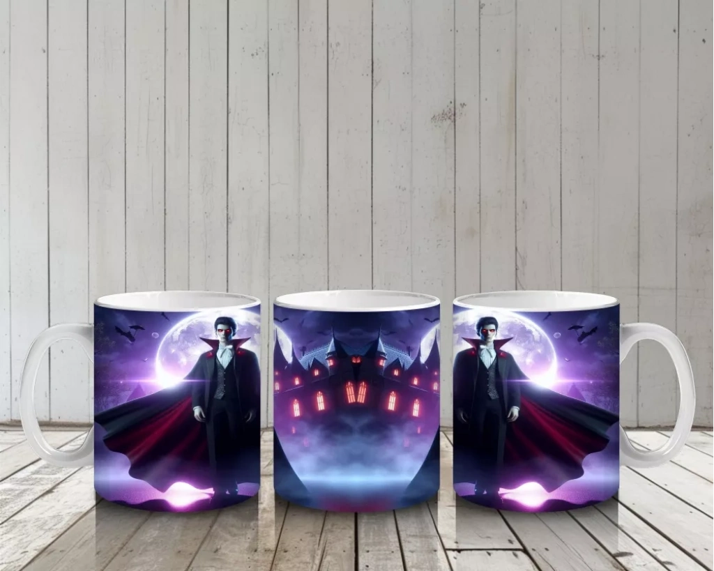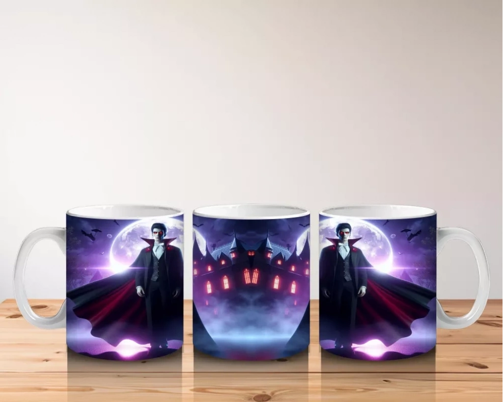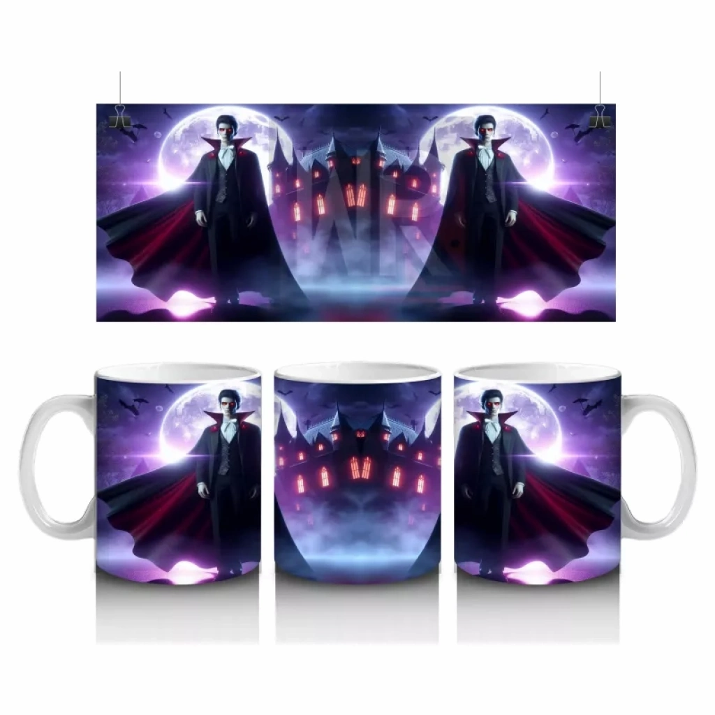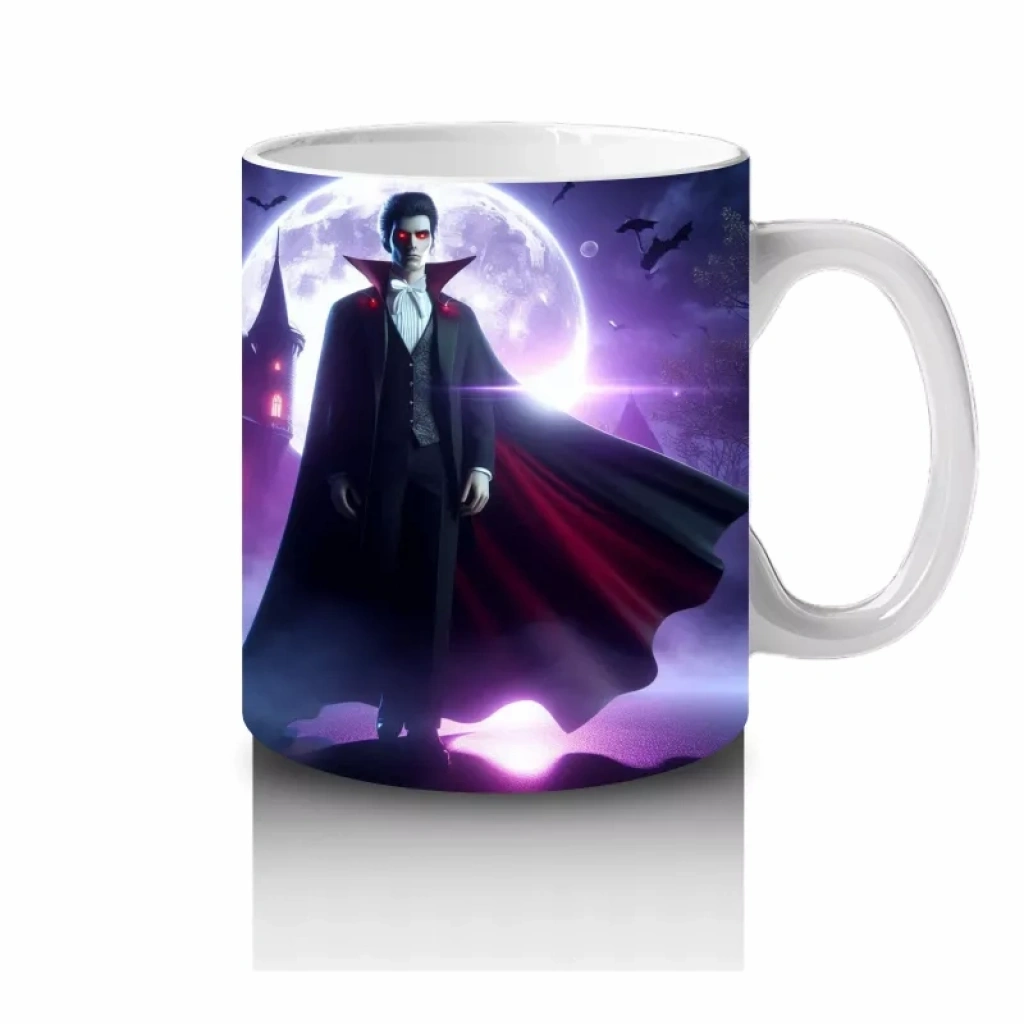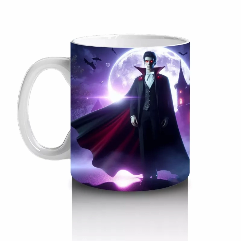 Mor ışıklarla aydınlatılmış korkunç vampir figürü baskısıyla bu kupa bardak, Cadılar Bayramı koleksiyonunuzun göz alıcı parçası olur.