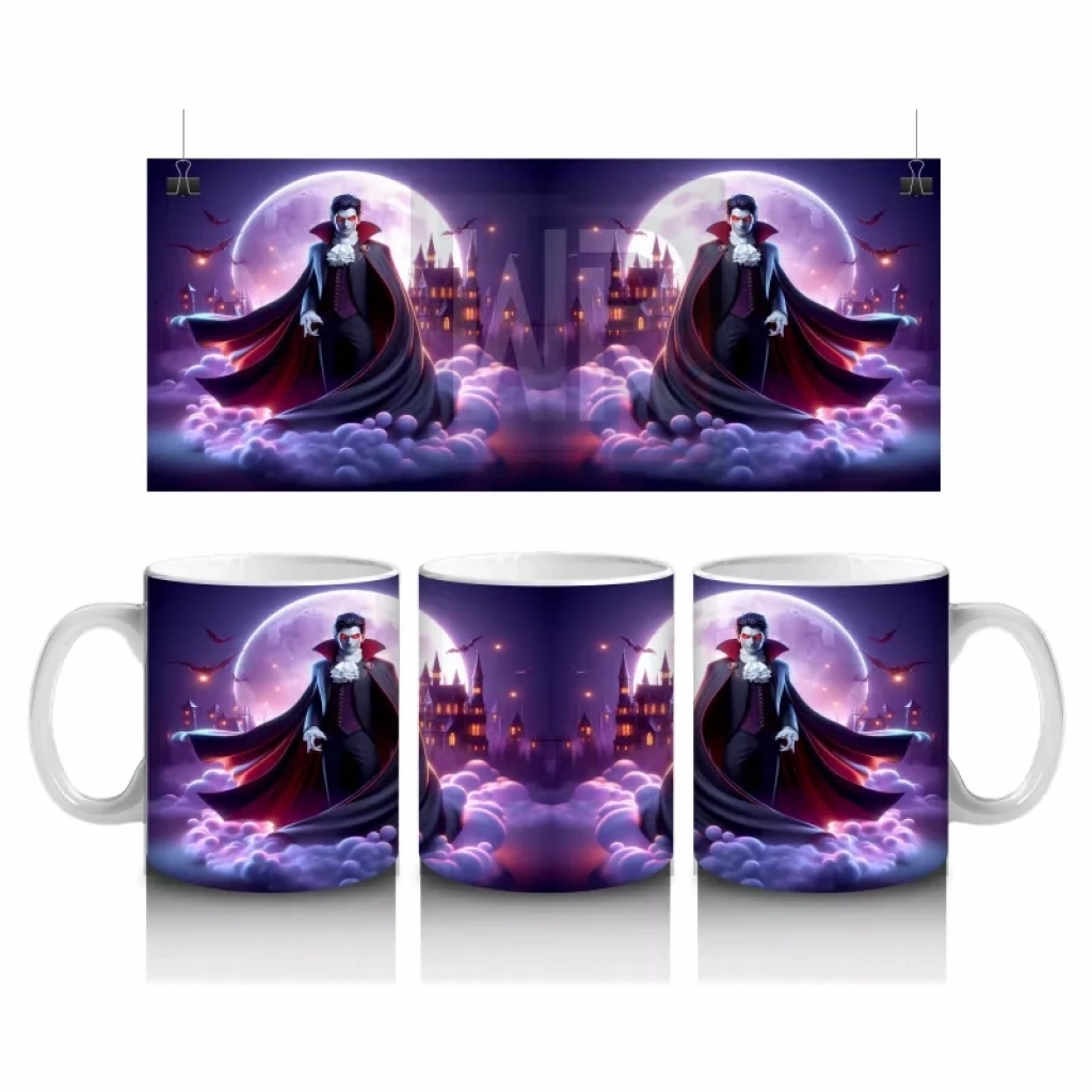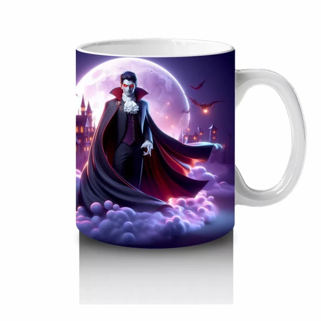 Mor ışıklı sahne üzerinde kırmızı pelerinli vampir figürüyle hazırlanan bu kupa, Halloween kutlamalarınıza çarpıcı ve etkileyici bir dokunuş yapar.