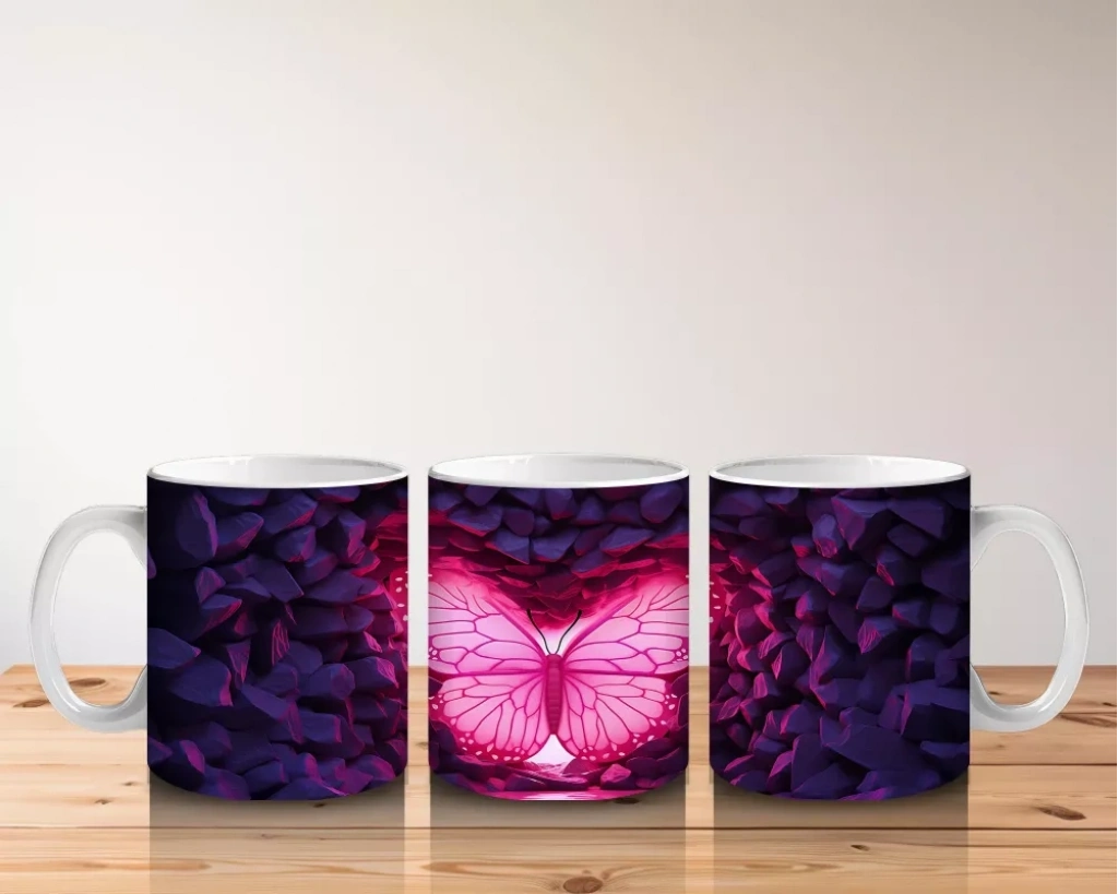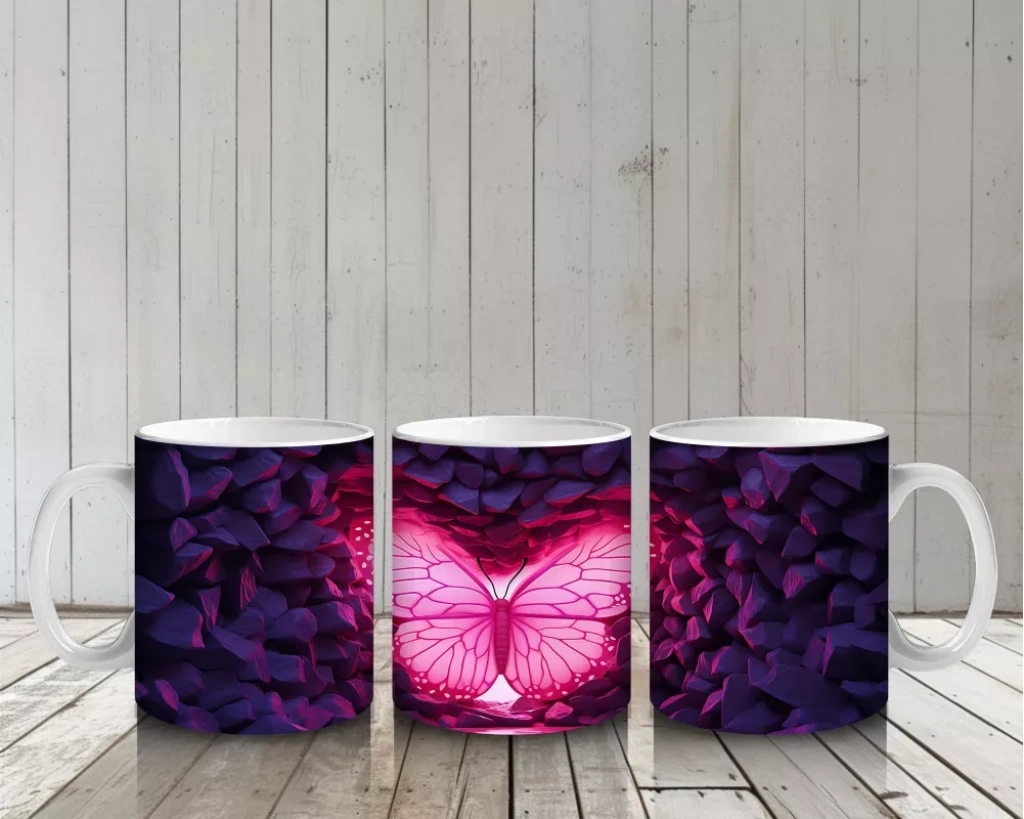 Mor Kristal Taşlar Arasında Parlayan Kelebek – Baskılı Kahve Kupası