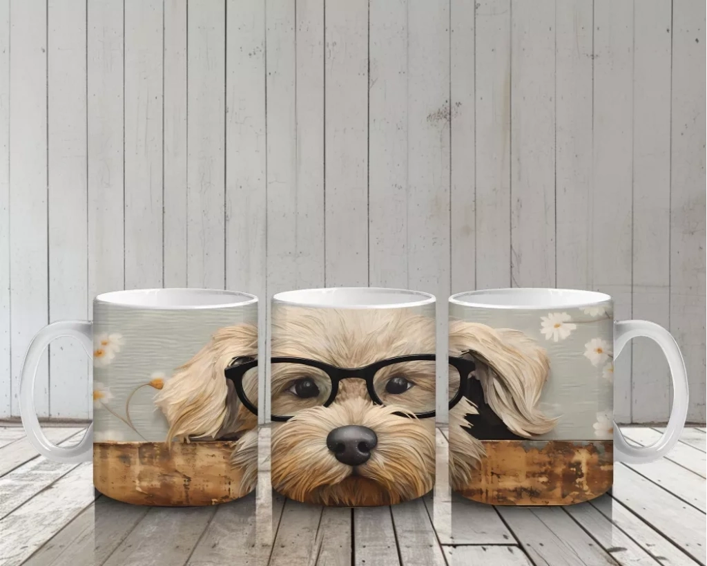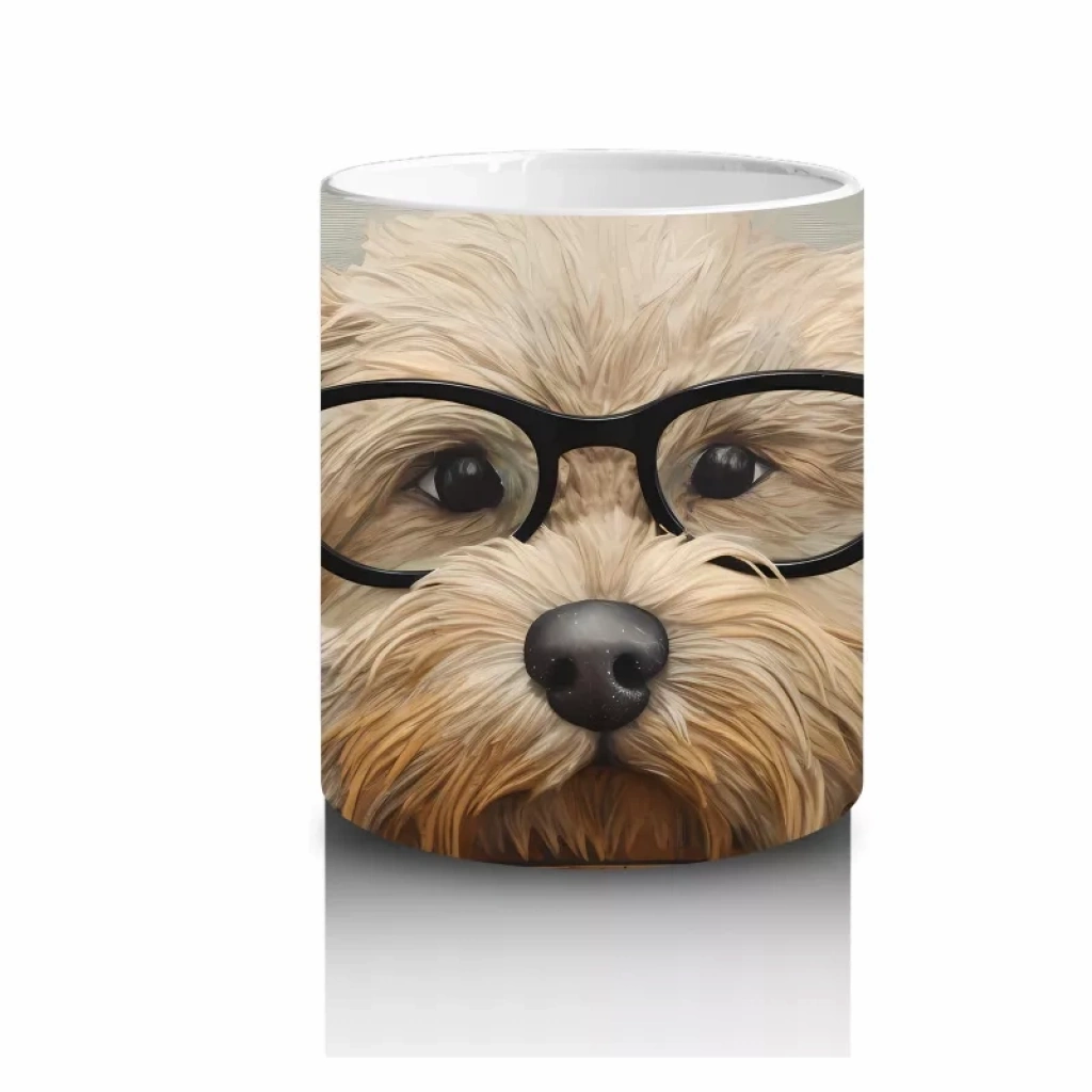Odun Üzerinde Gözlük Takmış Tatlı Köpek – Baskılı Kahve Kupası