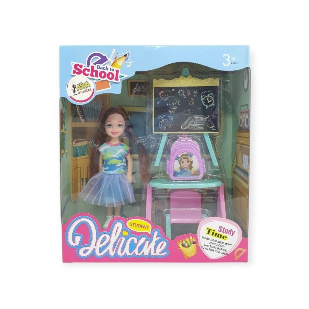 Set içerisinde 1 adet bebek , 1 adet masa-sıra , 1 adet yazı tahtası ve 1 adet çanta bulunmaktadır.