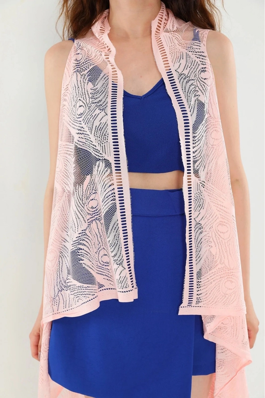 Pareo Dantel Yelek Mayo Bikini Üzeri Yaprak Desenli Püsküllü Plaj Elbisesi - Açık Pembe