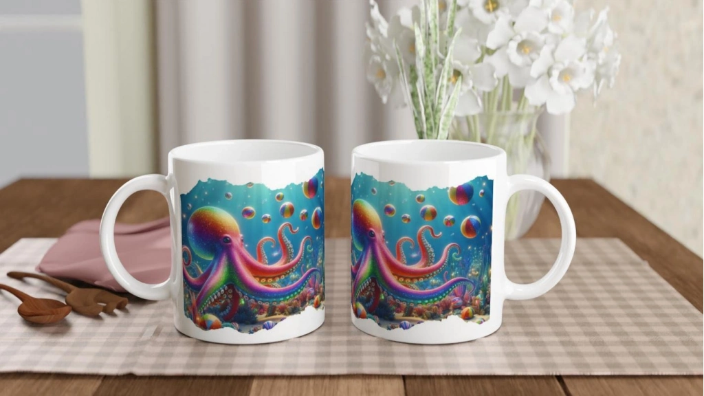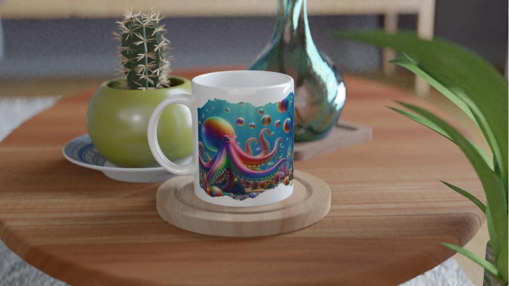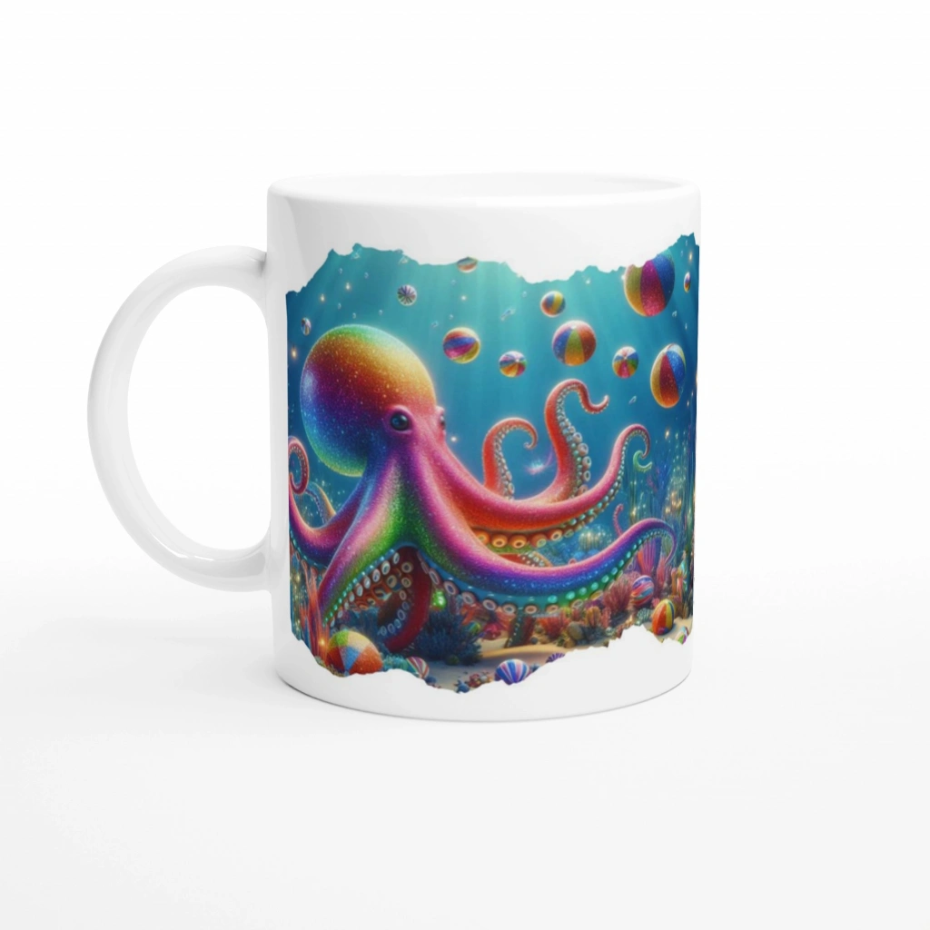 Deniz altının büyülü dünyasından ilham alan bu parlak renkli ahtapot baskılı kupa bardak,