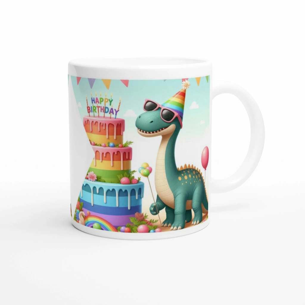 Çocuklara özel kupa, güneş gözlüklü neşeli dinozor ve renkli doğum günü pastası tasarımıyla partilere neşe katıyor.