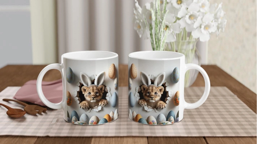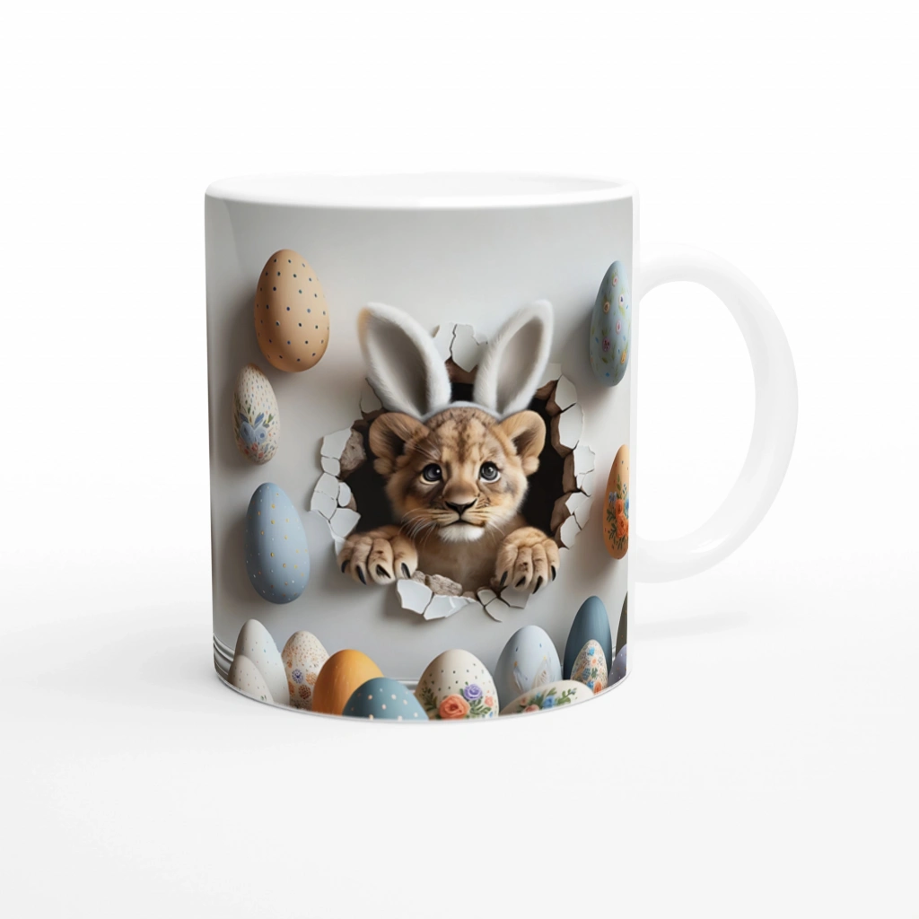 Paskalya Yumurtaları Arasında Tavşan Kulaklı Aslan Yavrusu Temalı Baskılı Kupa Bardak, hem yırtıcı bir masumiyeti hem de neşeli detaylarıyla dikkat çekiyor. Renkli yumurtalar ve kırık duvar efektiyle öne çıkan bu tasarım, bayram ruhunu yansıtan özgün bir hediye alternatifi sunuyor.