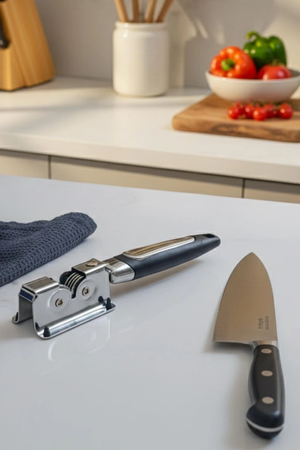 Ürün Hikayesi: Mutfaklarda pratiklik ve keskinlik isteyenler için tasarlanan paslanmaz çelik bıçak bileyici, bıçaklarınıza kısa sürede yeni bir keskinlik kazandırır. Siyah ergonomik sapı sayesinde kolay kavranır, mutfak tezgâhınızda güvenle kullanılabilir.