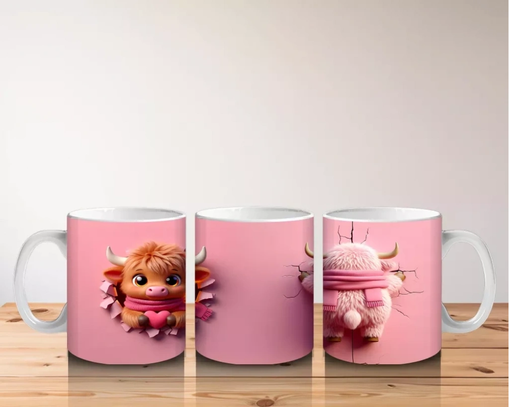 Pembe Arka Planda Sevimli Maskot ve Peluş Karakter – Baskılı Kahve Kupası