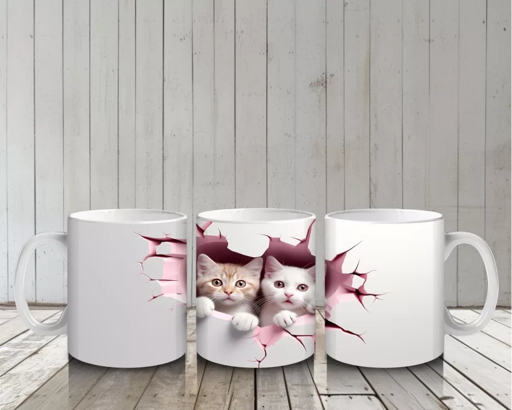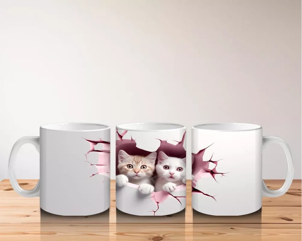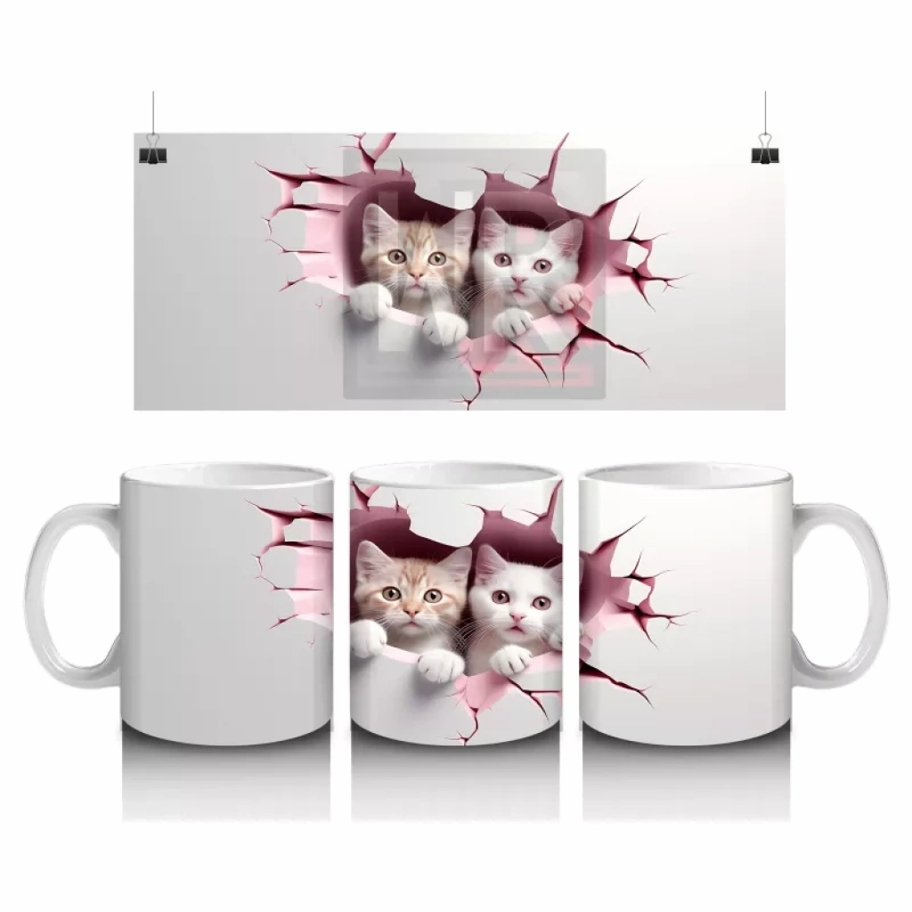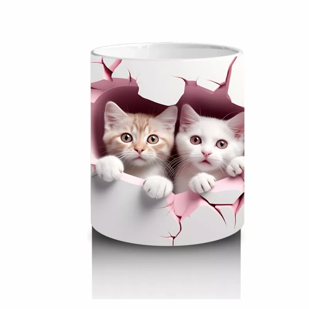 Pembe tonlardaki çatlak duvarın ardından merakla bakan iki minik yavru kedi, sıcak ve samimi bir atmosfer sunuyor. Sevimliliği ikiye katlayan bu tasarım, içten bir gülümseme arayanlara özel.