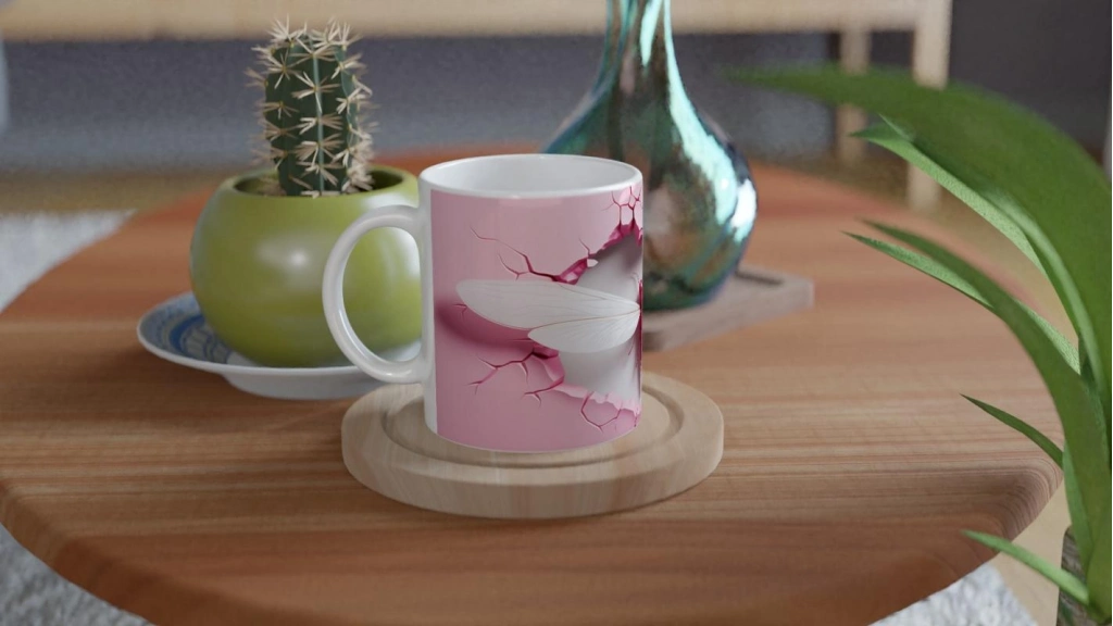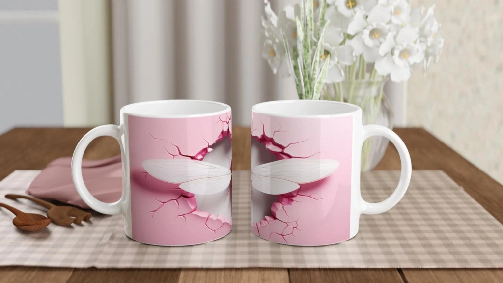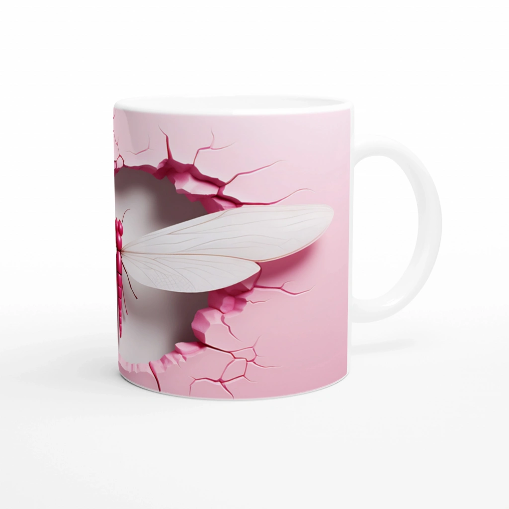 Pembe Çatlak Duvar Efektli Yusufçuk Temalı Baskılı Kupa Bardak, zarif beyaz kanatları ve dikkat çekici pembe tonlarıyla tasarım şıklığını yansıtıyor. Minimal tarzı sevenler için benzersiz bir hediye alternatifi.