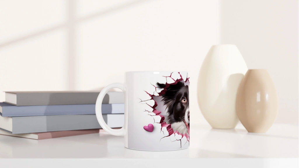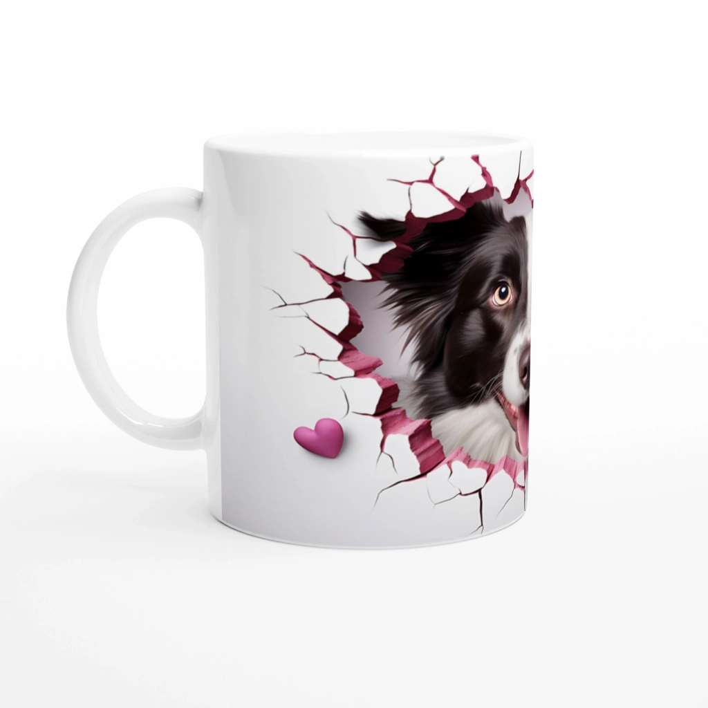 Pembe Çatlaktan Bakan Border Collie Temalı Baskılı Kupa Bardak, pembe çatlak duvar efektiyle çevrelenmiş neşeli köpek figürü ve yanında duran minik kalp detayıyla hem sevgi dolu hem eğlenceli bir atmosfer yaratıyor. Köpek dostlarını gülümsetecek özel bir tasarım.