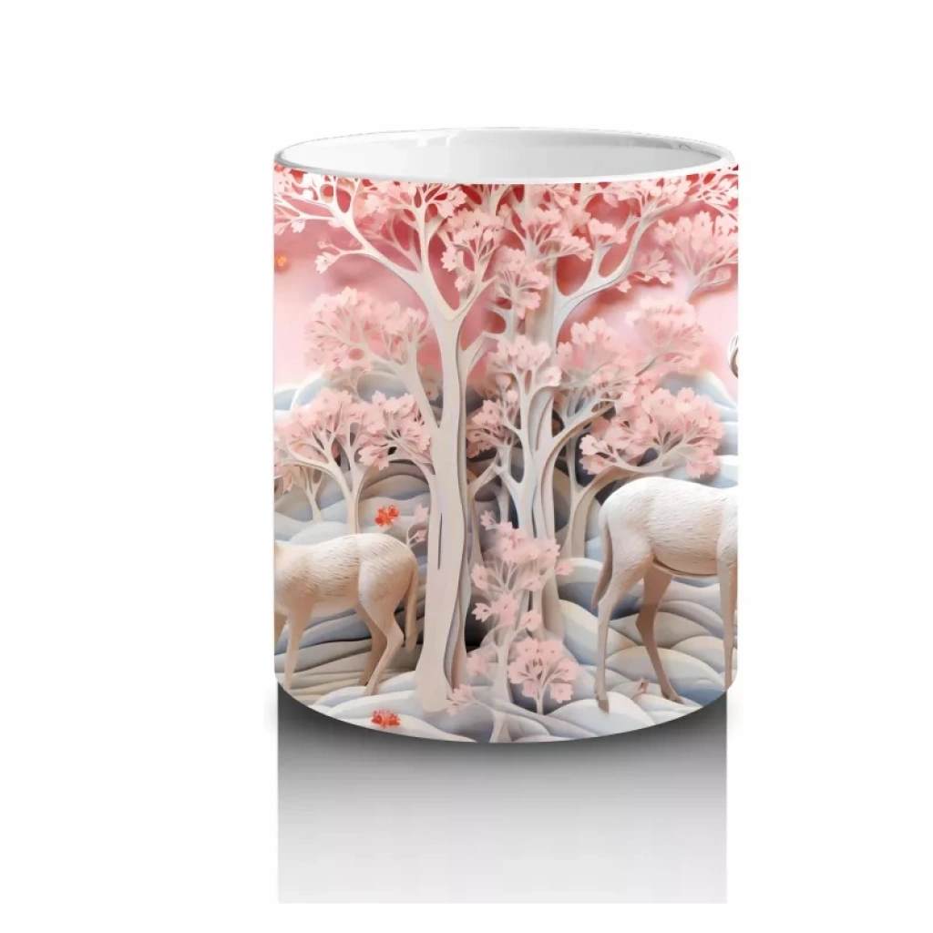 Pembe Çiçekler Arasında Geyik Çifti – Baskılı Kahve Kupası