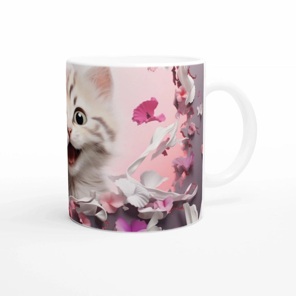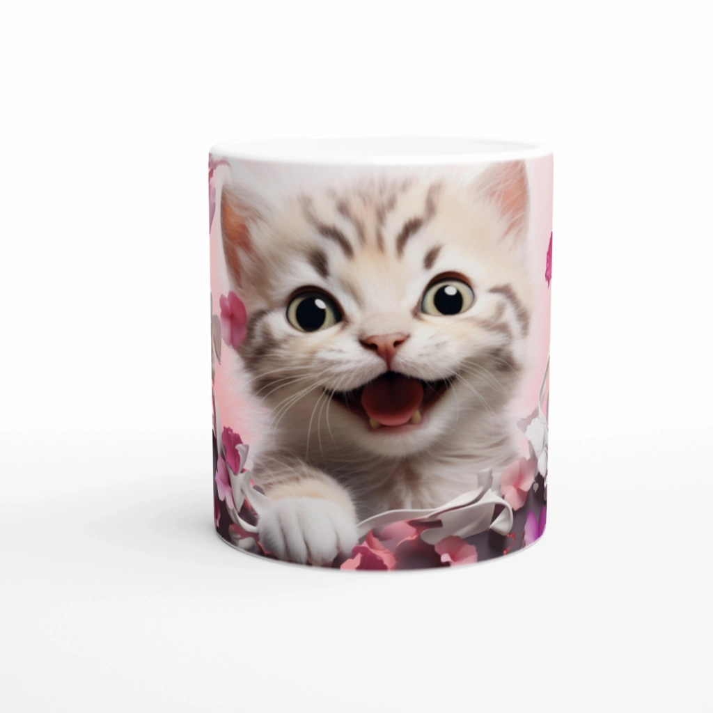 Pembe Çiçekler Arasında Neşeyle Bakan Yavru Kedi Baskılı Kupa Bardak, hem günlük kullanım hem de eğlenceli bir hediye alternatifi için ideal, sevimliliğiyle dikkat çeken özel bir tasarımdır.