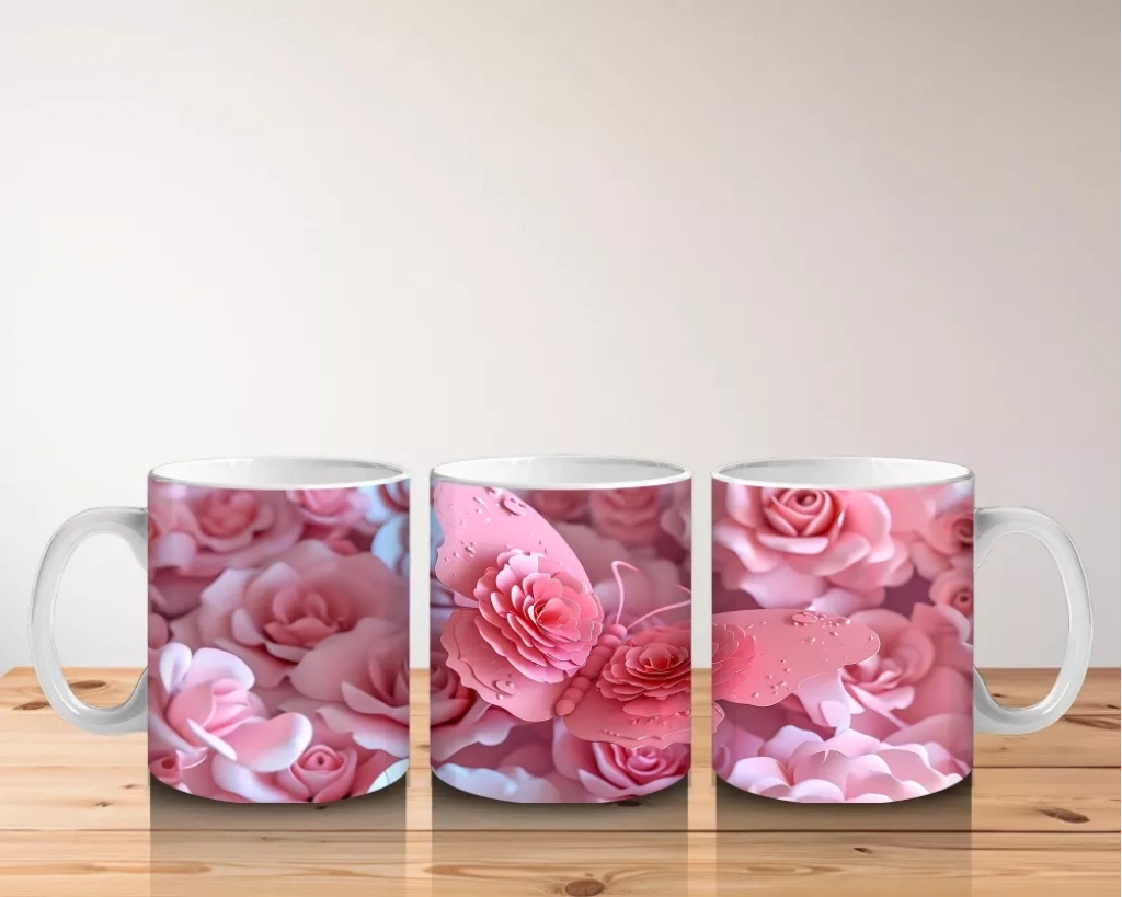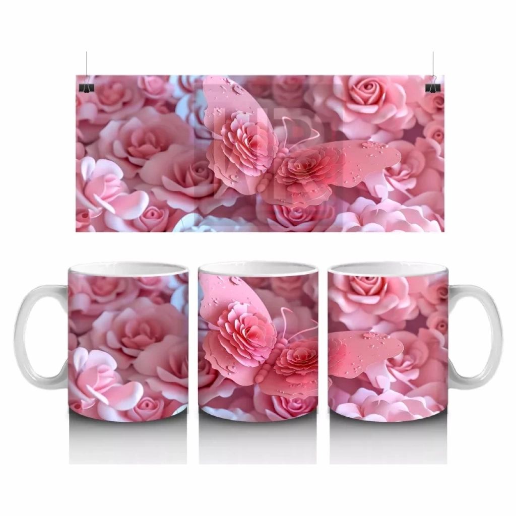 Pembe çiçeklerin üzerinde nazlı nazlı dinlenen bir kelebek… Baharın huzurunu her yudumda hissetmek isteyenlere özel bir tasarım.