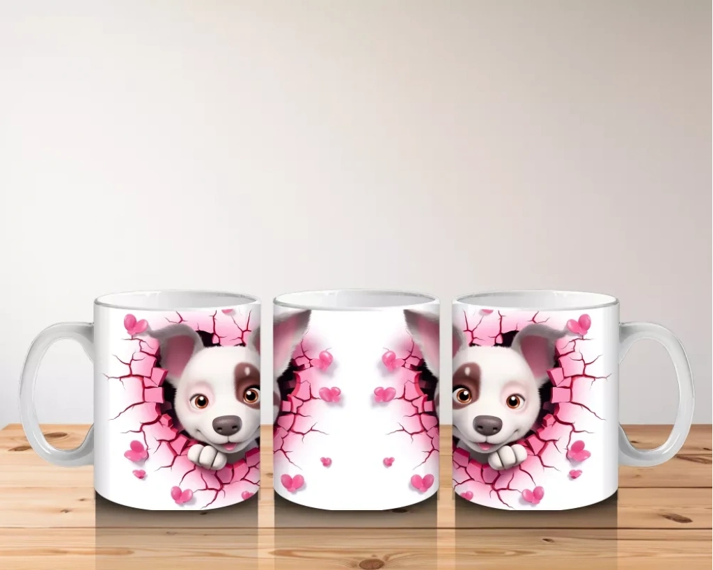 Pembe çiçeklerle süslenmiş çatlak zeminin içinden çıkan bu şirin köpek, hem zarif hem de neşeli bir görünüm sunuyor. Hayvanseverler için sıcak ve içten bir tasarım.