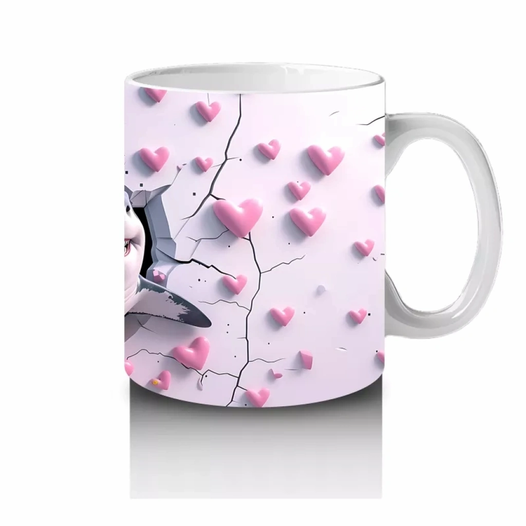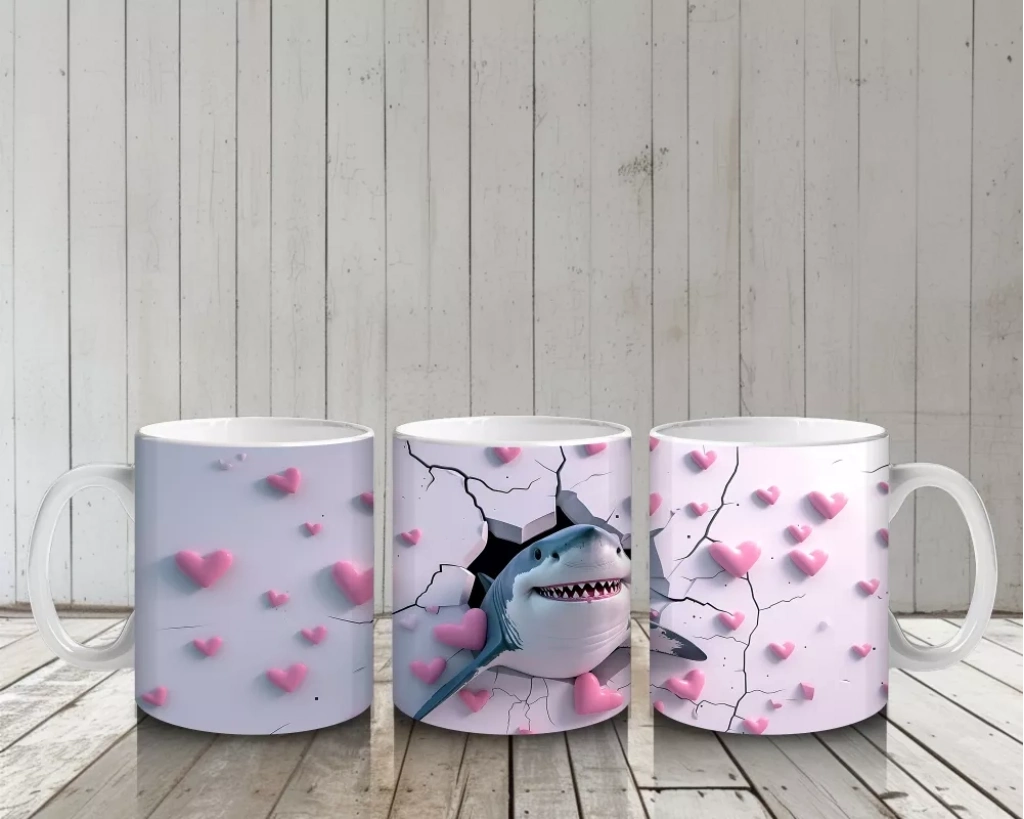 Pembe kalplerin arasında neşeyle zıplayan sevimli köpekbalığı, pozitif enerji ve sevgi dolu bir atmosfer yaratıyor. Sıcacık ve neşeli tasarımlar arayanlar için özel bir kupa.