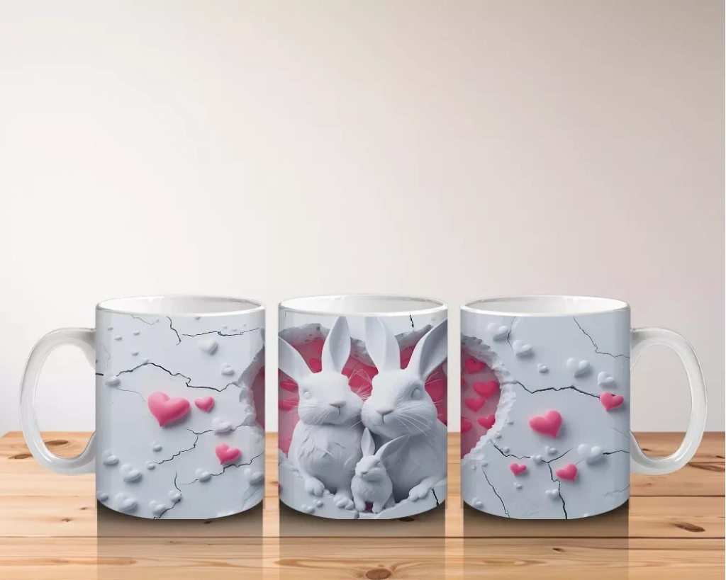 Aşk dolu pembe kalplerin arasında tatlı tavşanlar! Bu romantik ve neşeli kupa, hem çocuklar hem de hayvansever yetişkinler için harika bir seçim.