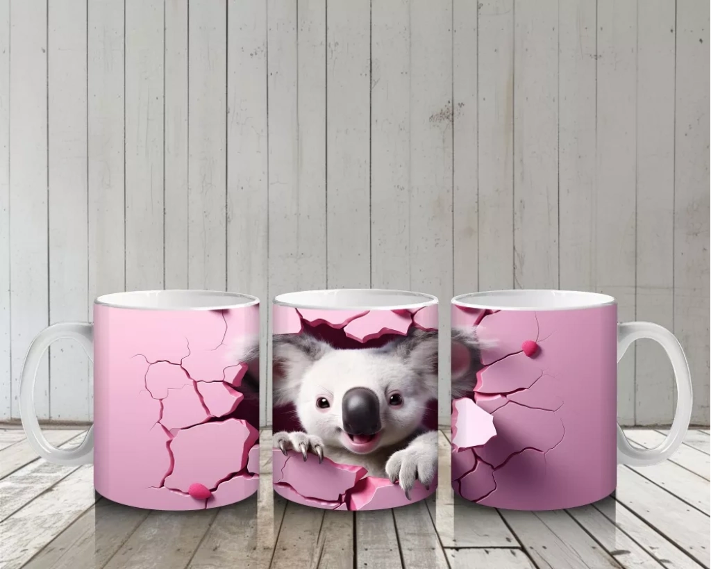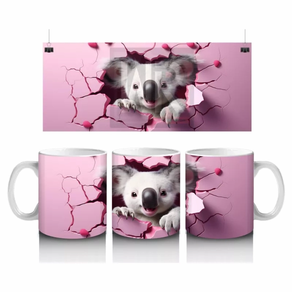 Pembe kalpli arka plan üzerinde duran sevimli koala illüstrasyonu, romantik ve sıcak bir görünüm sunuyor. İçten ve neşeli detayları sevenler için ideal bir kupa tasarımı.