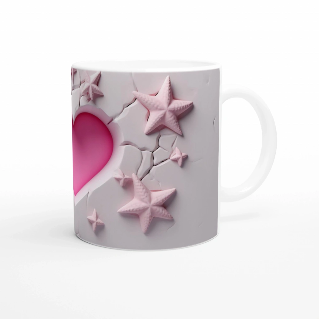 Pembe Kalpli Duvar ve Deniz Yıldızları Temalı Baskılı Kupa Bardak, çatlamış yüzeyin ortasında yer alan kalp şekli ve çevresini saran yumuşak tonlardaki deniz yıldızlarıyla hem romantik hem de ferahlatıcı bir atmosfer yaratır. Sahil tutkunları ve romantik ruhlar için eşsiz bir hediye alternatifi.