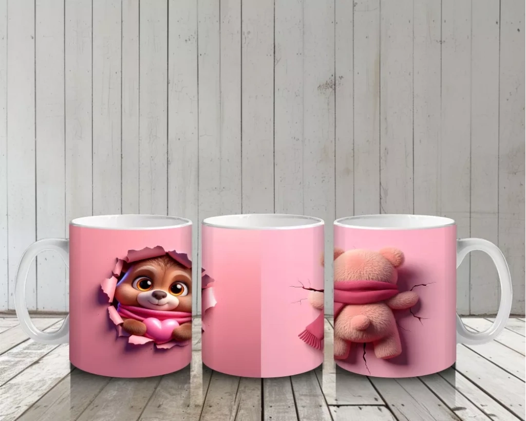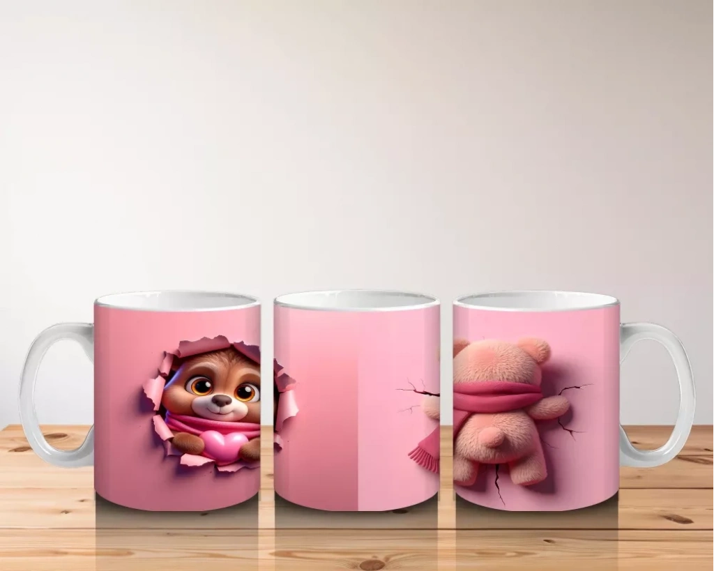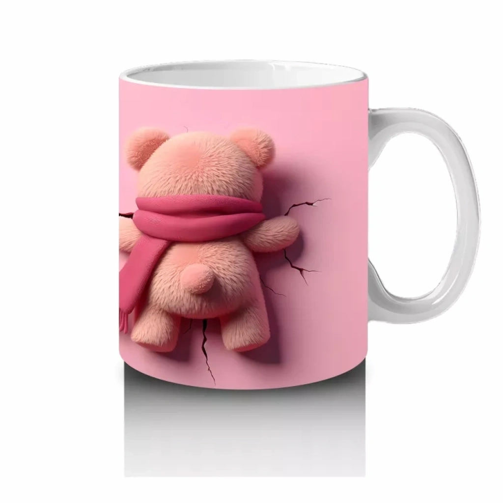 Pembe Kalpli Maskot ve Peluş Ayıcık – Baskılı Kahve Kupası