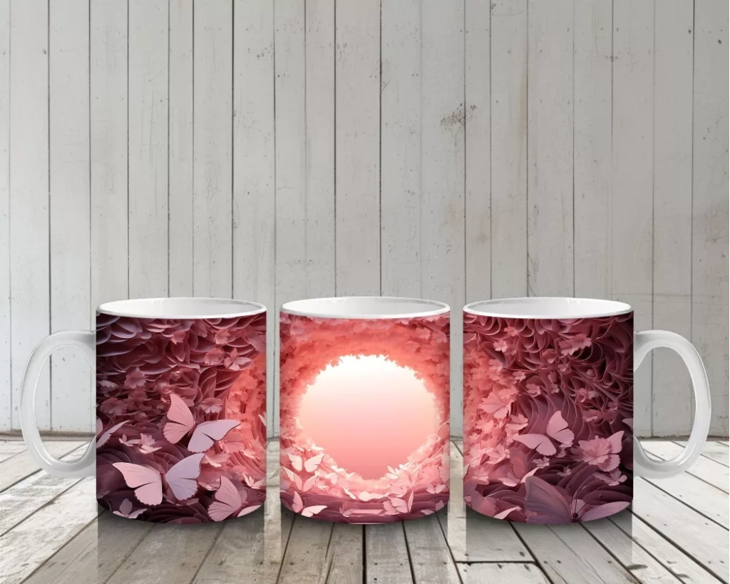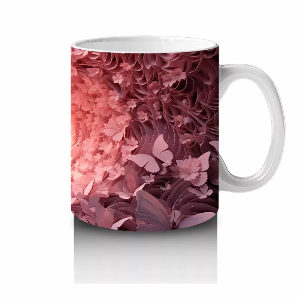 Pembe Kelebeklerle Oluşan Işık Tüneli Kompozisyonu – Baskılı Kahve Kupası
