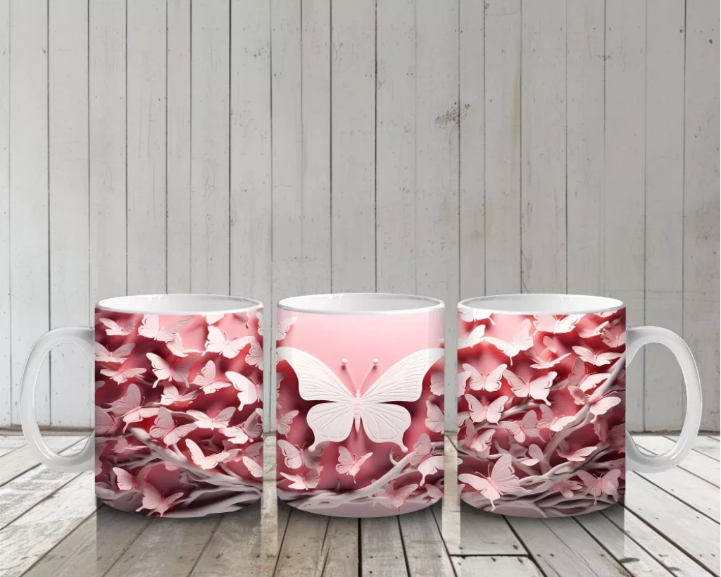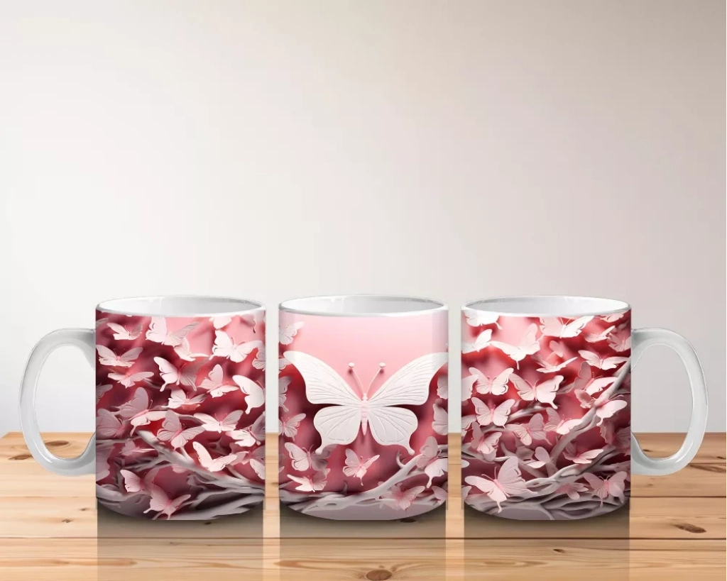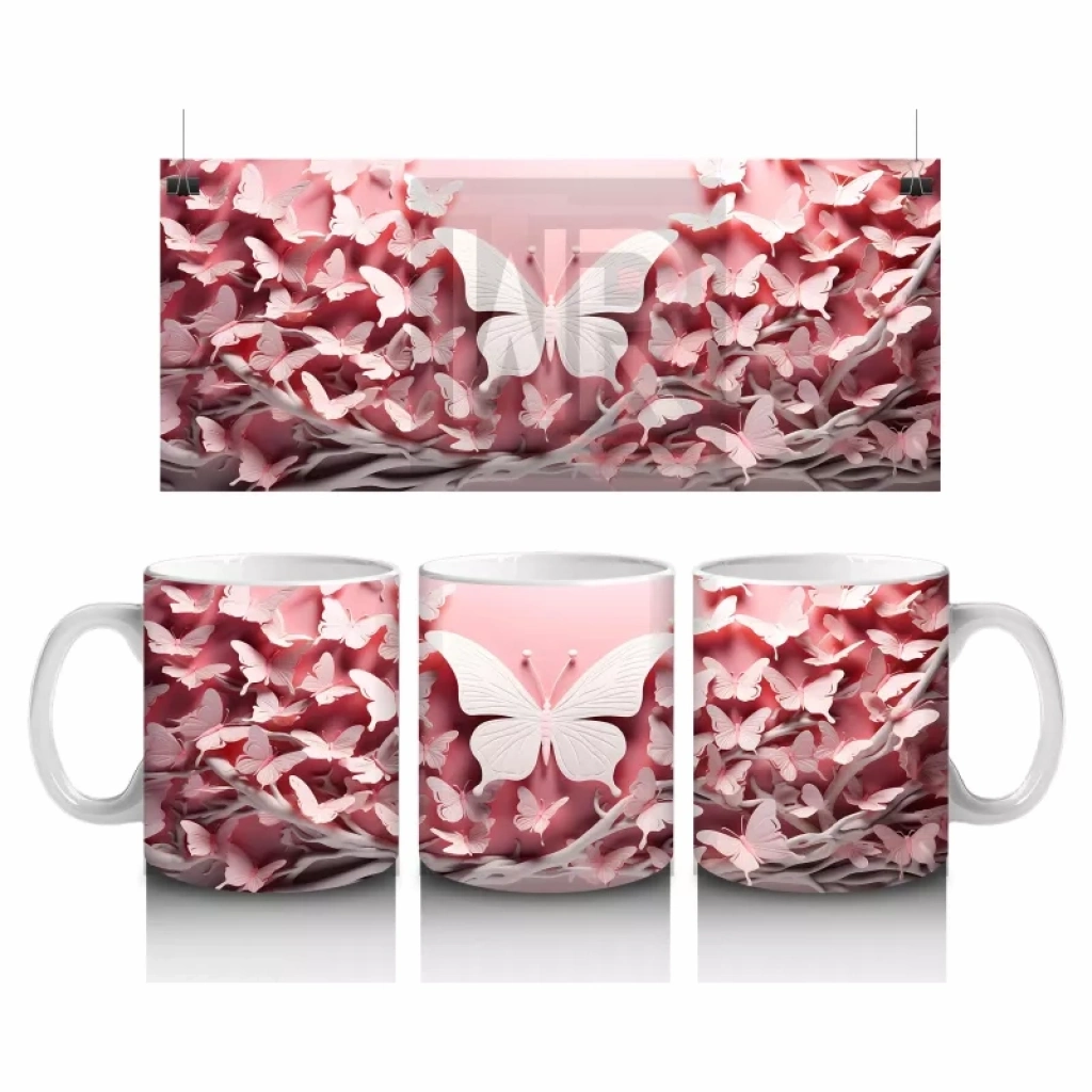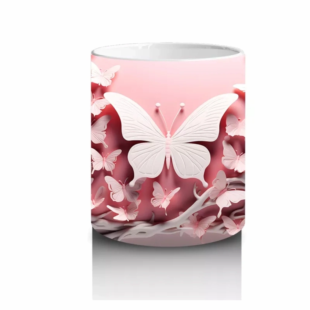 Pembe Yapraklar Arasında Beyaz Kelebek – Baskılı Kahve Kupası