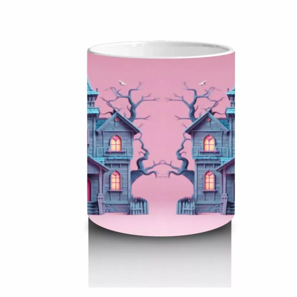 Perili Şato Önünde Sevimli Cadı Kız Figürlü Pembe Cadılar Bayramı Baskılı Kupa BardakPerili şato önünde sevimli cadı kız figürüyle tasarlanan bu pembe kupa bardak, Cadılar Bayramı’na tatlı ve büyülü bir hava katar.